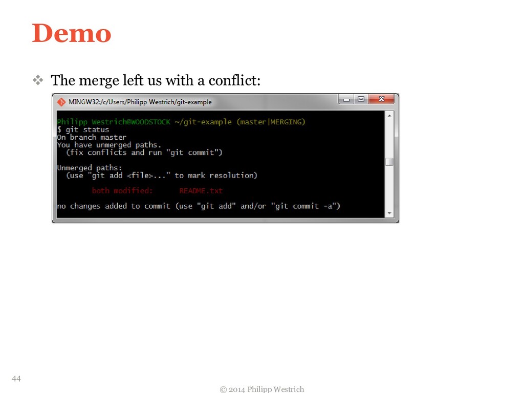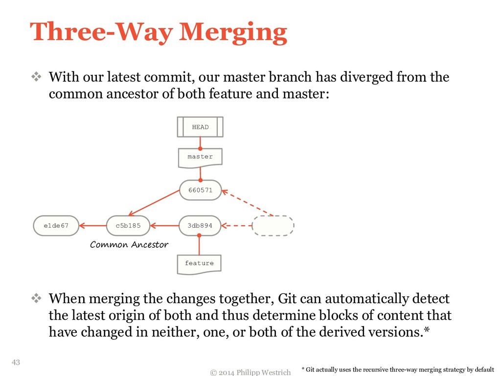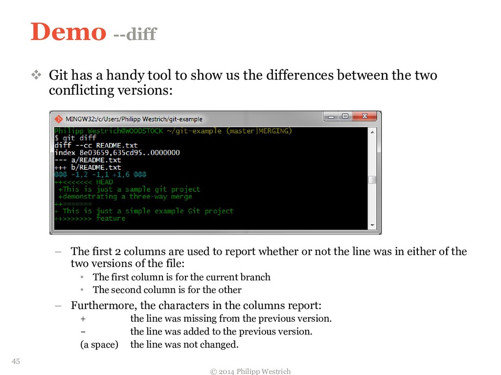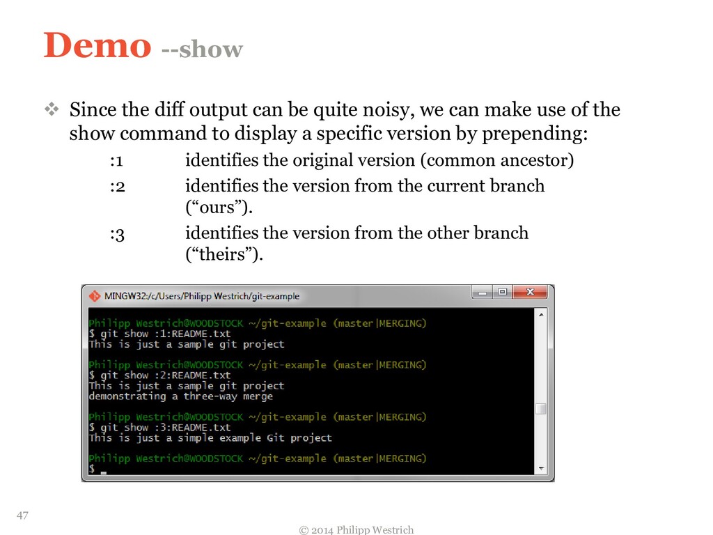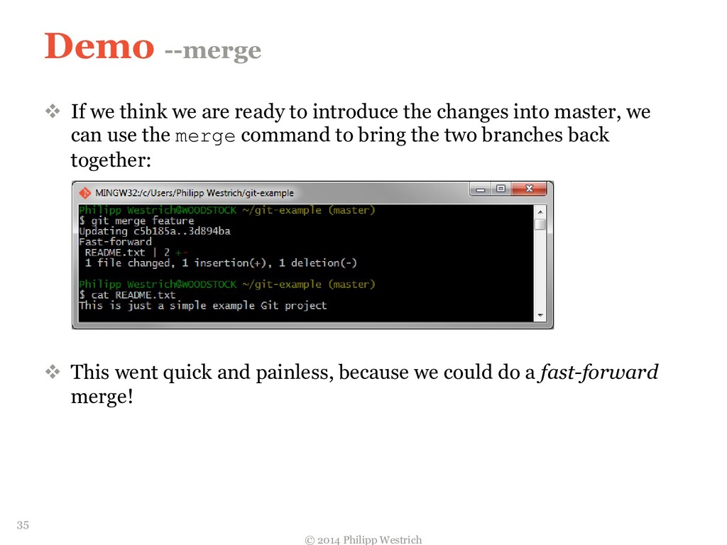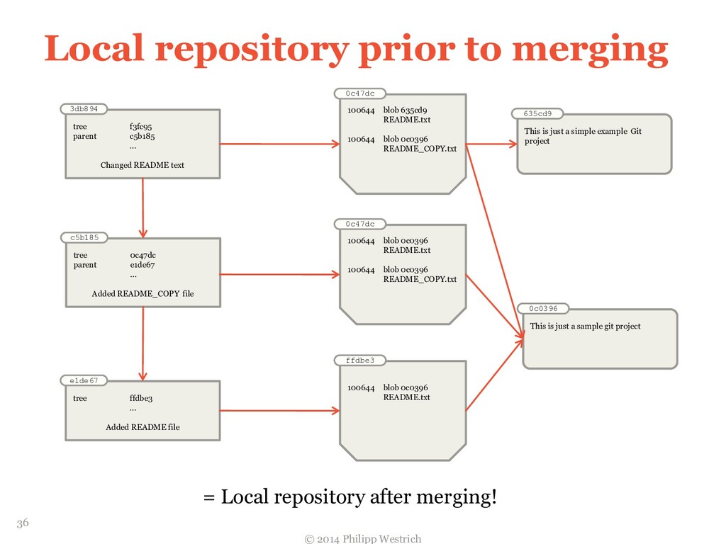 tree ffdbe3 … Added README file ffdbe3 100644 blob 0c0396 README.txt 0c0396 This is just a sample git project c5b185 tree 0c47dc parent e1de67 … Added README_COPY file 0c47dc 100644 blob 0c0396 README.txt 100644 blob 0c0396 README_COPY.txt 3db894 tree f3fc95 parent c5b185 … Changed README text 0c47dc 100644 blob 635cd9 README.txt 100644 blob 0c0396 README_COPY.txt 635cd9 This is just a simple example Git project = Local repository after merging! 36