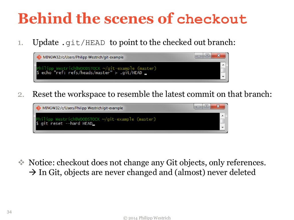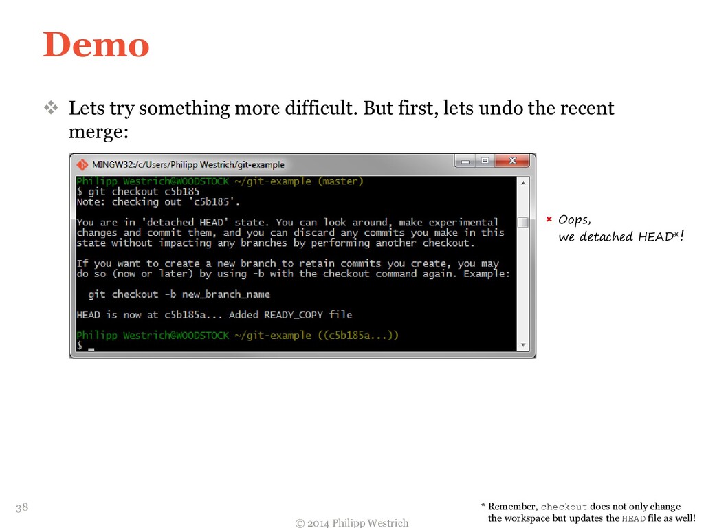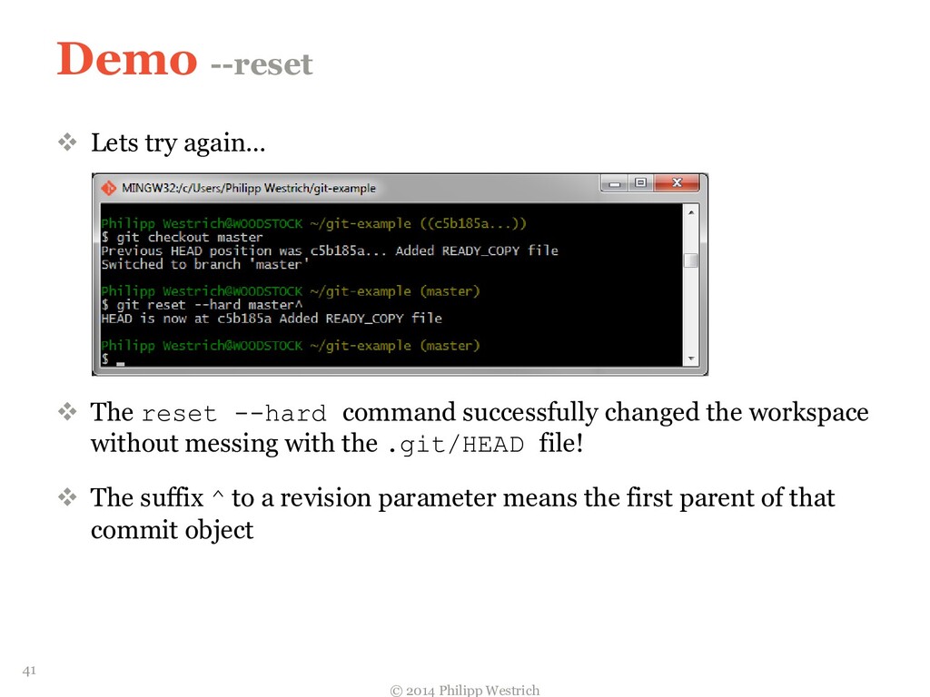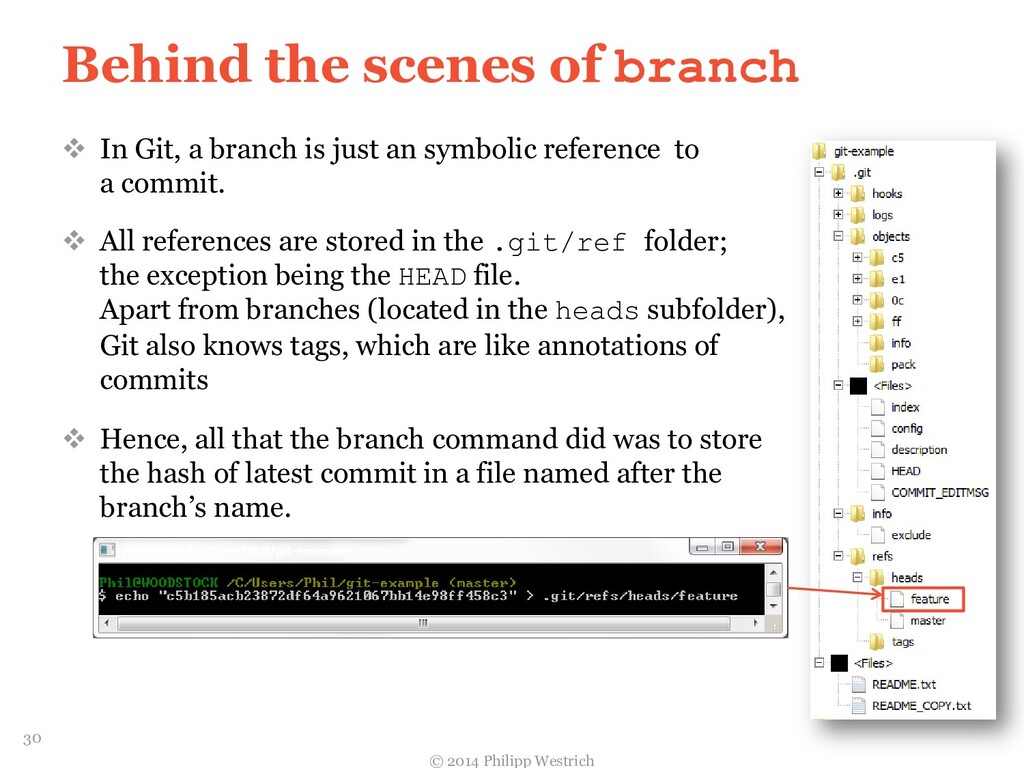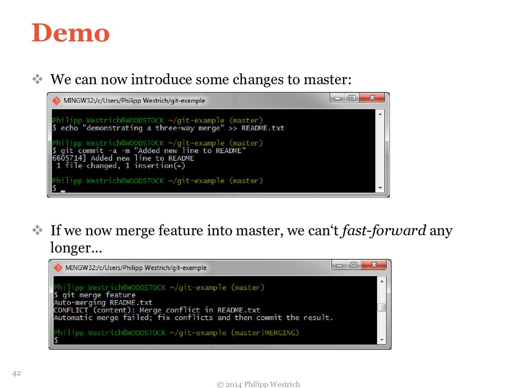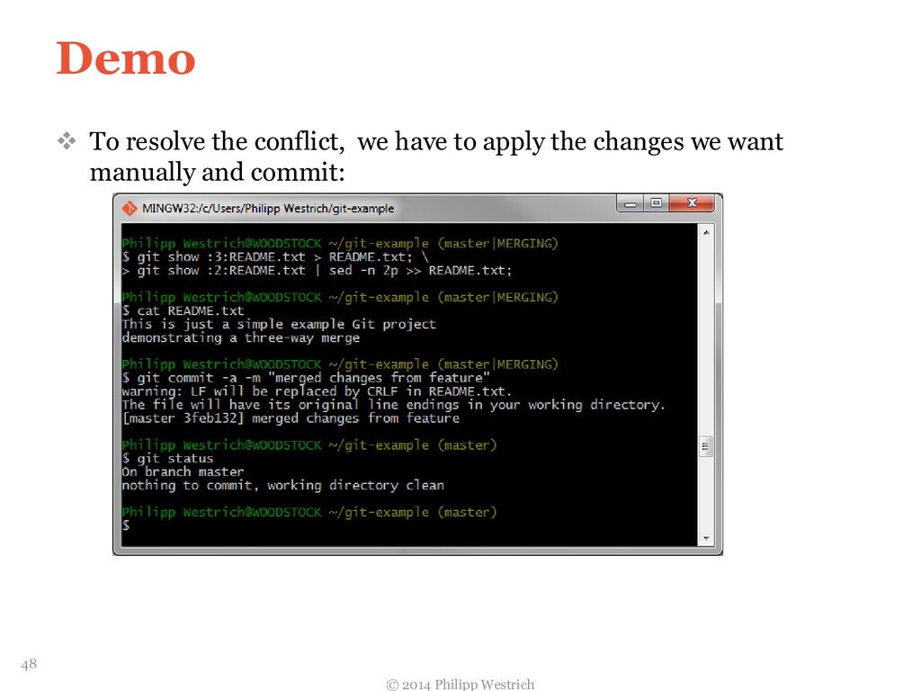 tree ffdbe3 … Added README file ffdbe3 100644 blob 0c0396 README.txt 0c0396 This is just a sample git project c5b185 tree 0c47dc parent e1de67 … Added README_COPY file 0c47dc 100644 blob 0c0396 README.txt 100644 blob 0c0396 README_COPY.txt 3db894 tree f3fc95 parent c5b185 … Changed README text 0c47dc 100644 blob 635cd9 README.txt 100644 blob 0c0396 README_COPY.txt 635cd9 This is just a simple example Git project = Local repository after merging! 36