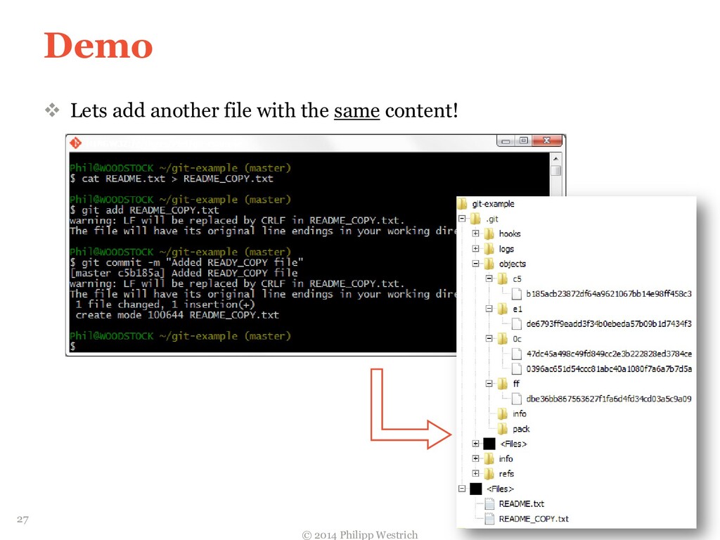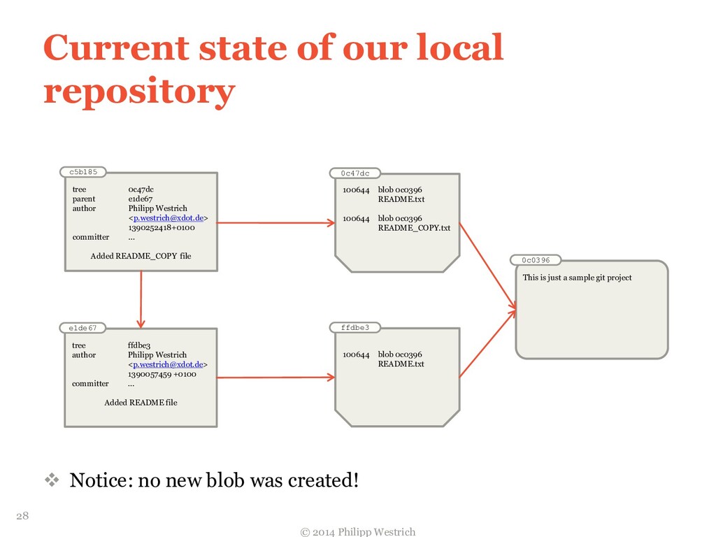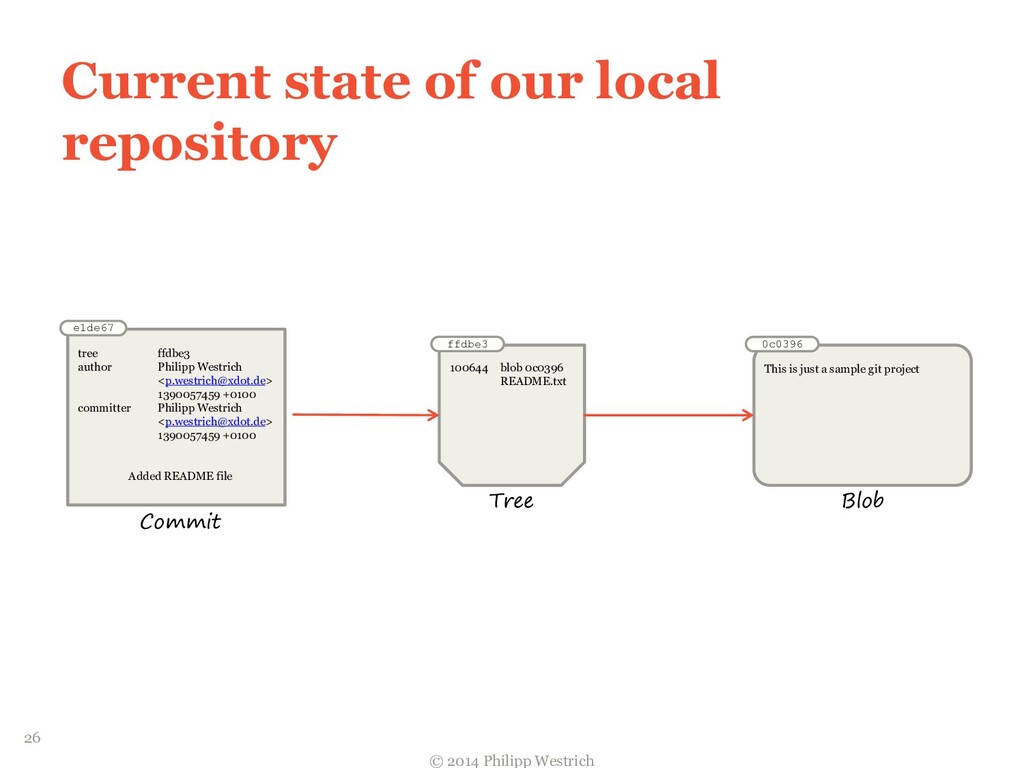 Commit e1de67 tree ffdbe3 author Philipp Westrich <[email protected]> 1390057459 +0100 committer Philipp Westrich <[email protected]> 1390057459 +0100 Added README file ffdbe3 100644 blob 0c0396 README.txt Tree 0c0396 This is just a sample git project Blob 26