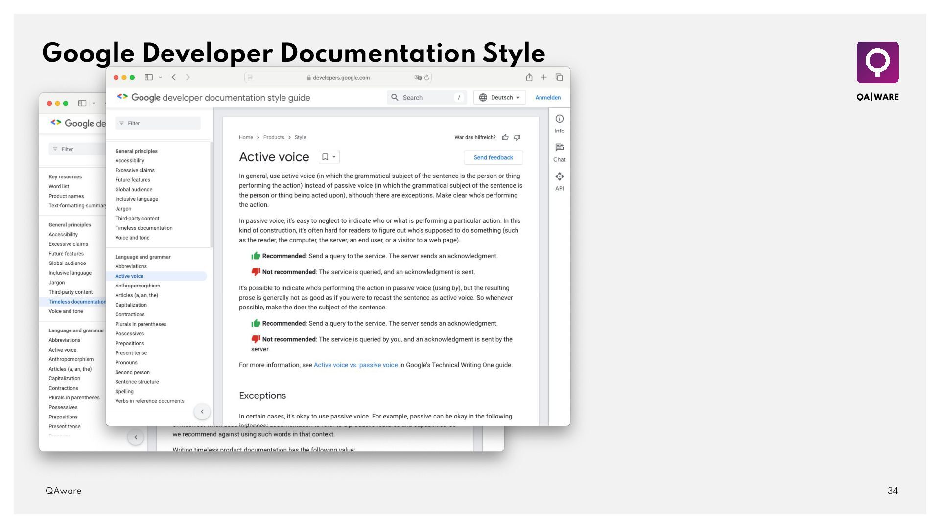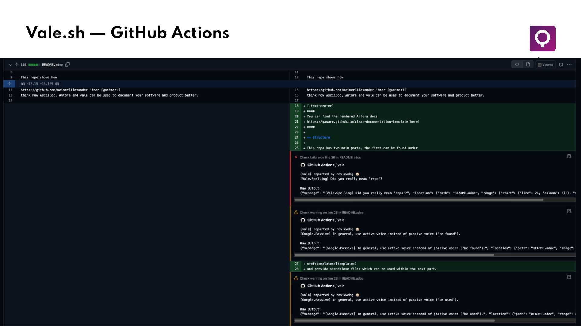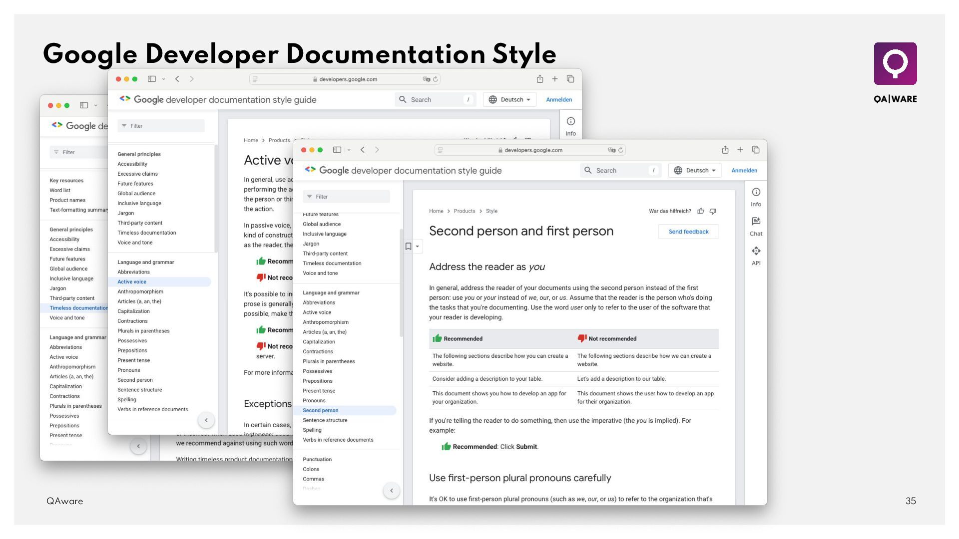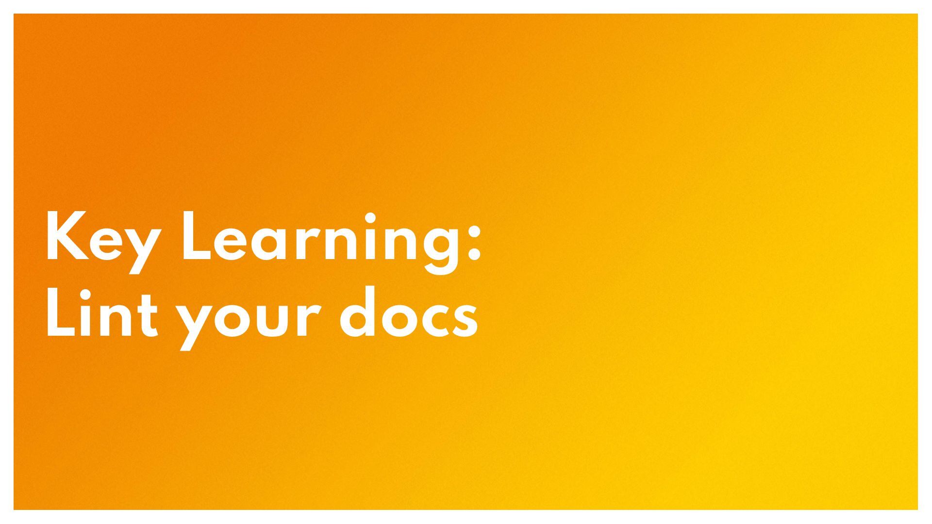 Im zweiten technischen Teil schauen wir uns an, wie man große Dokumentationen, die aus vielen Repositories bestehen, handhabbar macht, wie man gut durchsuchbare Dokumentationsseiten erstellt und wie man Linter benutzt, um einen guten Stil einzuhalten.