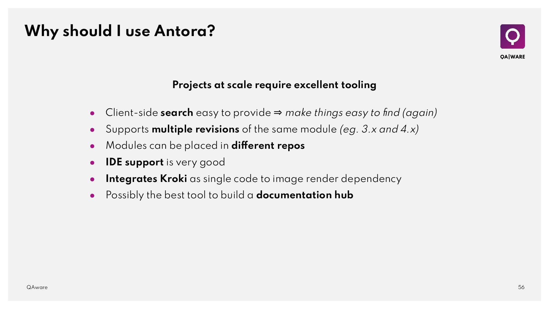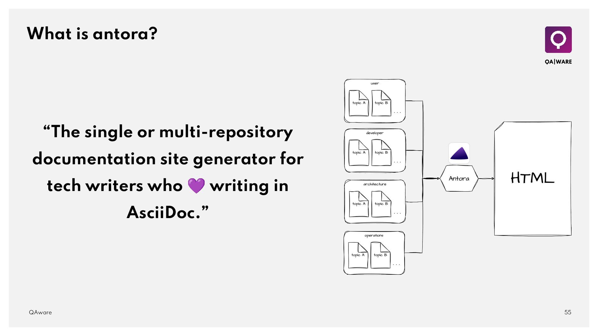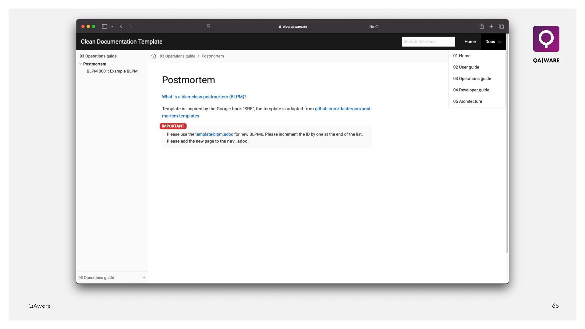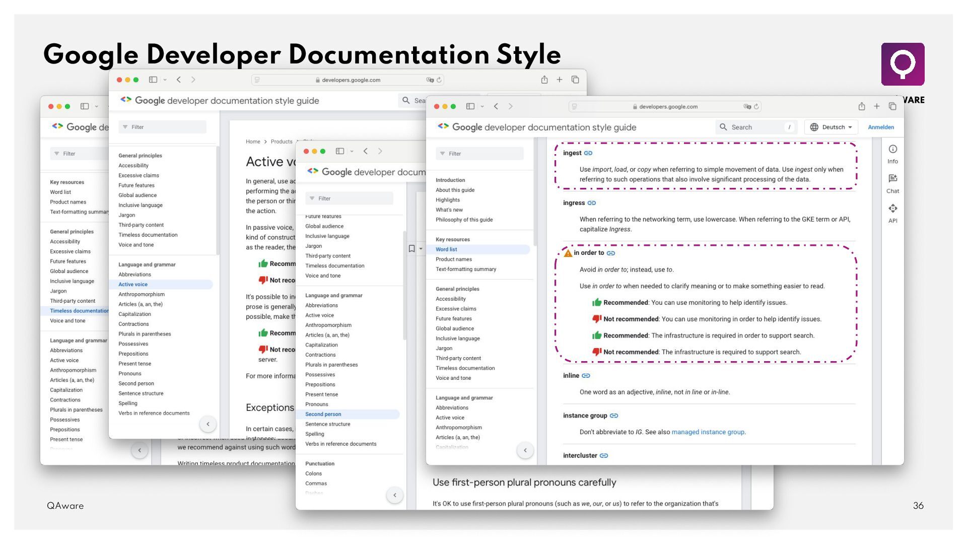 Im zweiten technischen Teil schauen wir uns an, wie man große Dokumentationen, die aus vielen Repositories bestehen, handhabbar macht, wie man gut durchsuchbare Dokumentationsseiten erstellt und wie man Linter benutzt, um einen guten Stil einzuhalten.