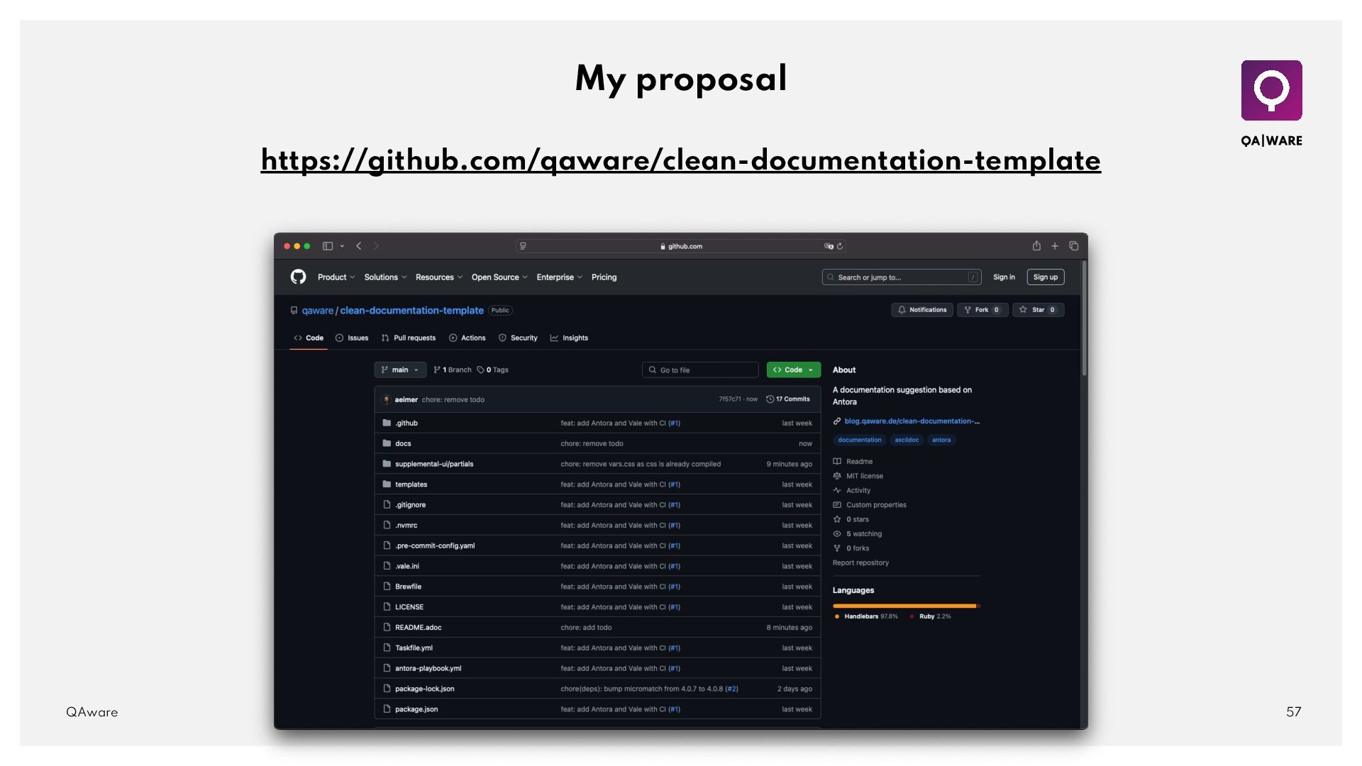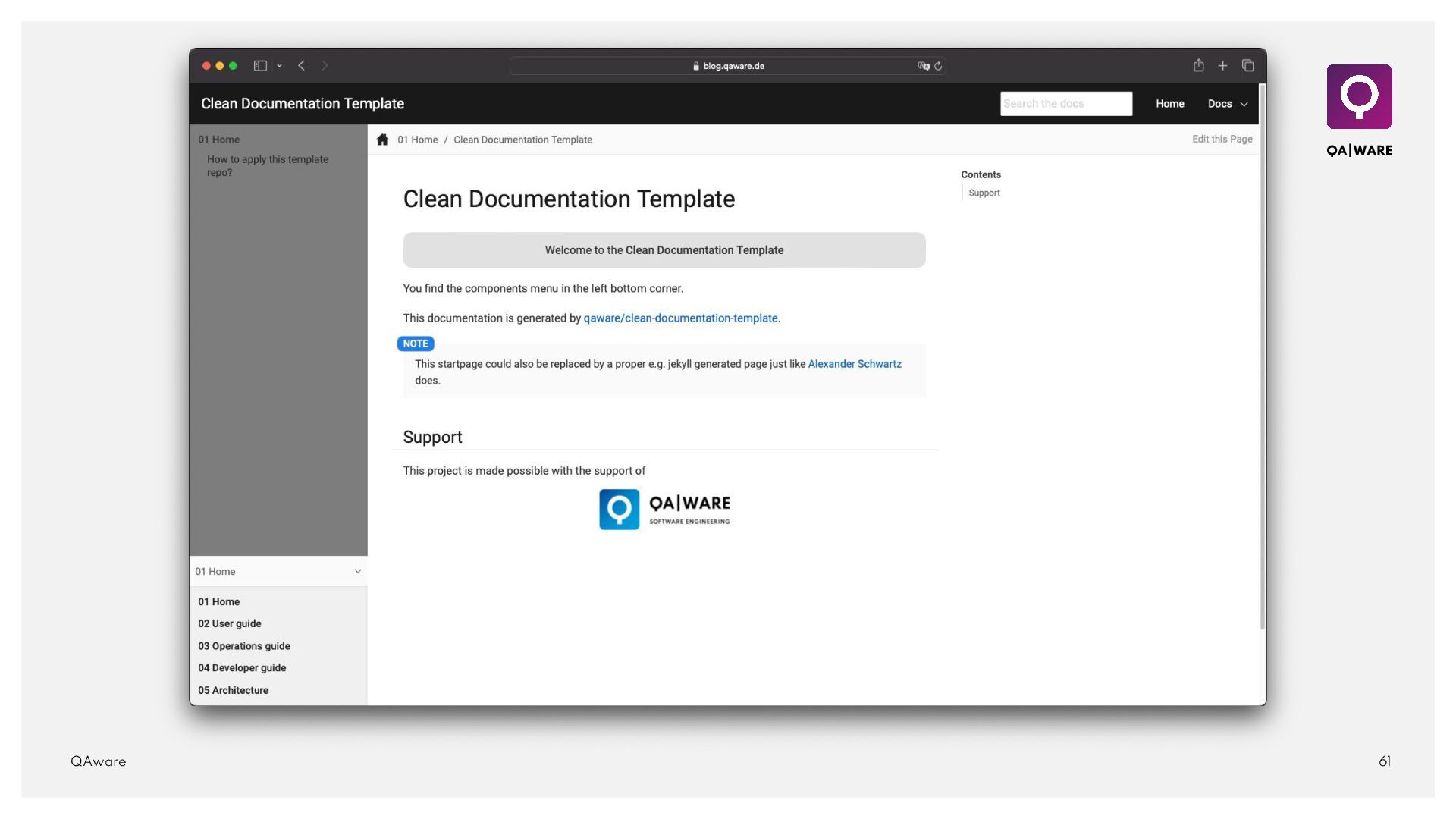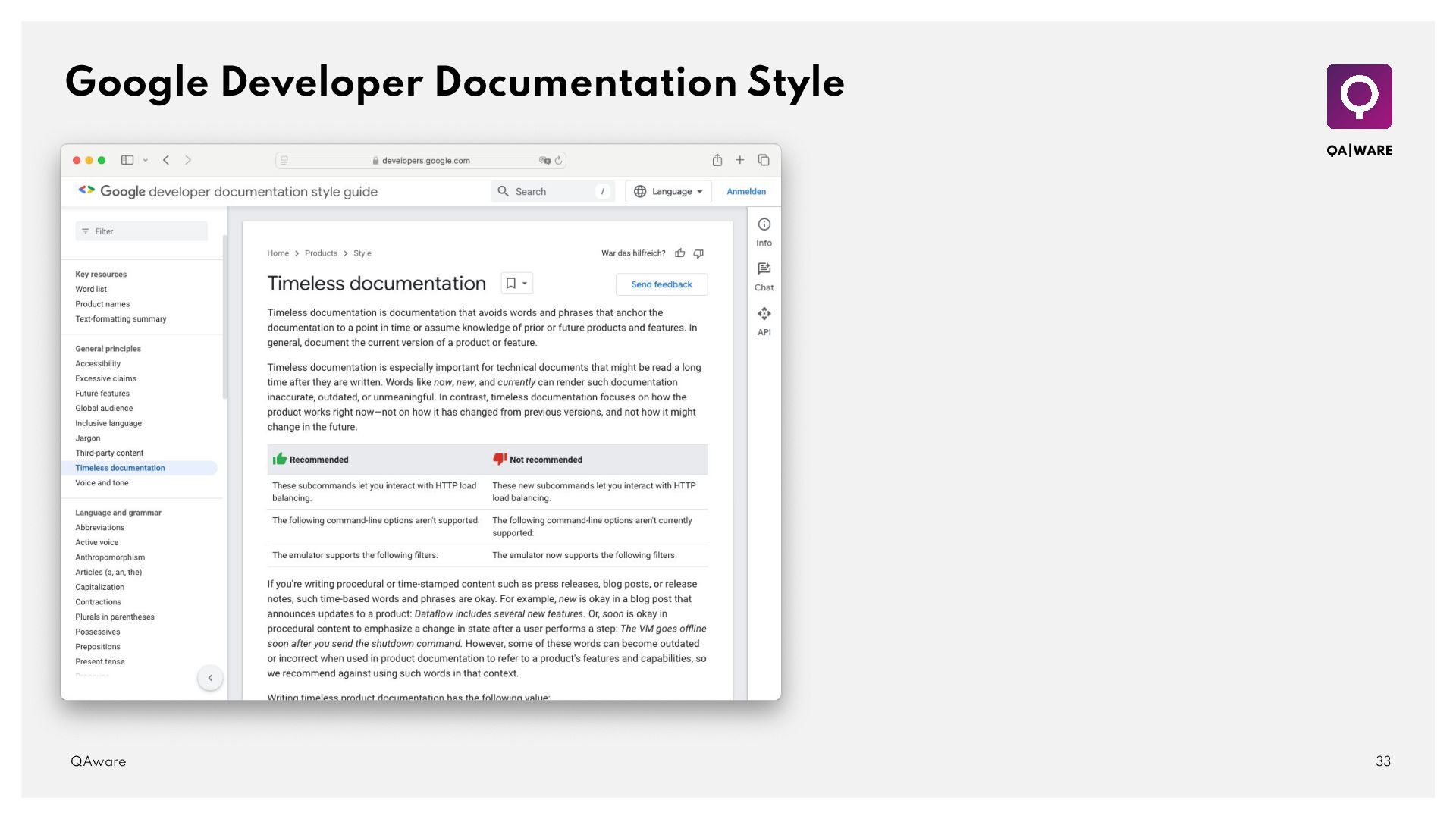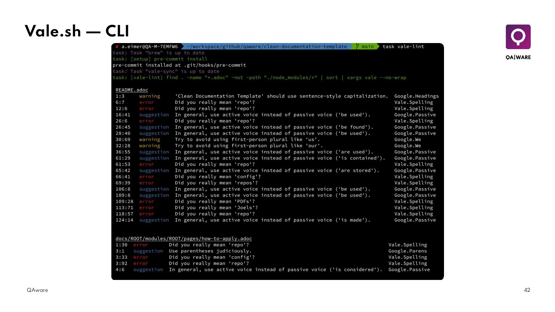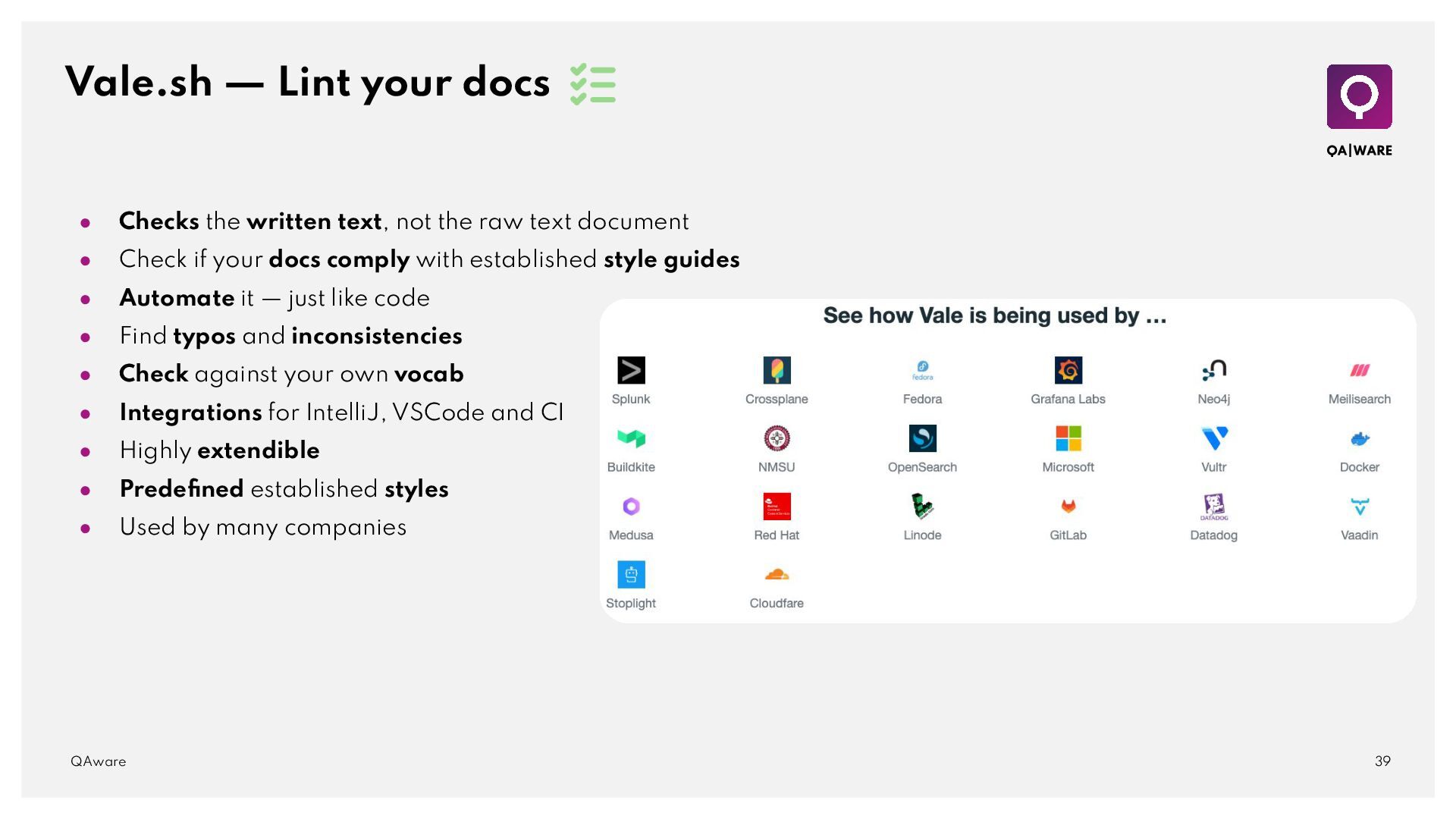 Im zweiten technischen Teil schauen wir uns an, wie man große Dokumentationen, die aus vielen Repositories bestehen, handhabbar macht, wie man gut durchsuchbare Dokumentationsseiten erstellt und wie man Linter benutzt, um einen guten Stil einzuhalten.