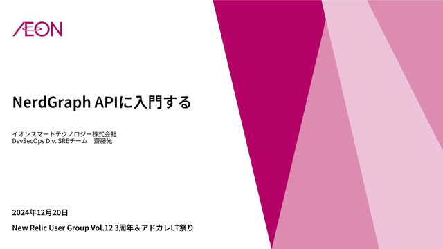 NerdGraph APIに⼊⾨する イオンスマートテクノロジー株式会社 DevSecOps Div. SREチーム 齋藤光 2024年12⽉20⽇ New Relic