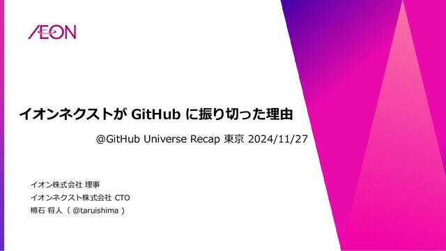 2024年11月27日開催、「GitHub Universe Recap tokyo 2024」の登壇資料です。 登壇者 イオンネクスト株式会社 CTO 樽石 将人 https://github.registration.goldcast.io/events/f3d6dfde-6341-4a07-a0d0-c93a03ff540e