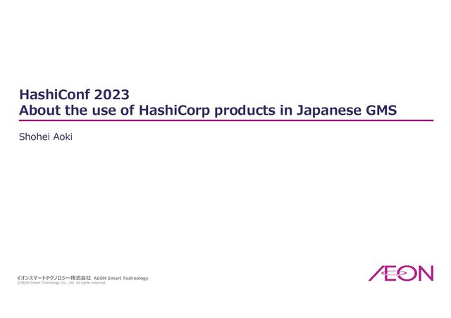AEON Smart Technology About ME Shohei Aoki • Platform Engineer at AEON Smart Technology (Provide the mobile apps, various API platforms for retail companies) • Certification: Azure • Hobby: drinking, jogging • https://www.linkedin.com/in/shohei-aoki-7653a2202/