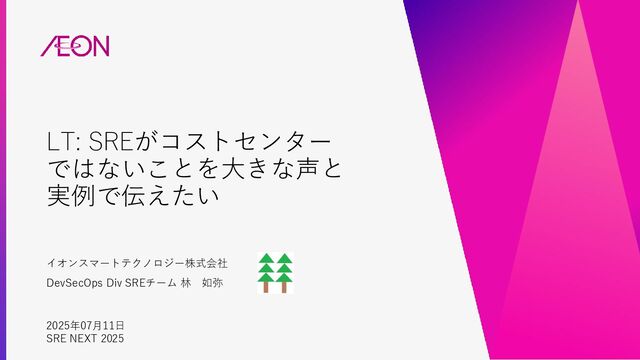 LT: SREがコストセンター ではないことを大きな声と 実例で伝えたい イオンスマートテクノロジー株式会社 DevSecOps Div SREチーム 林 如弥