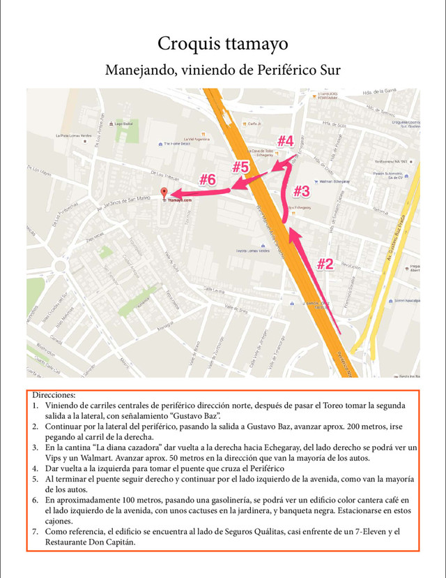 después de pasar el Toreo tomar la segunda salida a la lateral, con señalamiento “Gustavo Baz”. 2. Continuar por la lateral del periférico, pasando la salida a Gustavo Baz, avanzar aprox. 200 metros, irse pegando al carril de la derecha. 3. En la cantina “La diana cazadora” dar vuelta a la derecha hacia Echegaray, del lado derecho se podrá ver un Vips y un Walmart. Avanzar aprox. 50 metros en la dirección que van la mayoría de los autos. 4. Dar vuelta a la izquierda para tomar el puente que cruza el Periférico 5. Al terminar el puente seguir derecho y continuar por el lado izquierdo de la avenida, como van la mayoría de los autos. 6. En aproximadamente 100 metros, pasando una gasolinería, se podrá ver un edificio color cantera café en el lado izquierdo de la avenida, con unos cactuses en la jardinera, y banqueta negra. Estacionarse en estos cajones. 7. Como referencia, el edificio se encuentra al lado de Seguros Quálitas, casi enfrente de un 7-Eleven y el Restaurante Don Capitán. Croquis ttamayo Manejando, viniendo de Periférico Sur