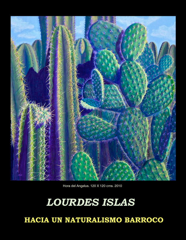 que salta a la vista al ver sus obras es el conocimiento del oficio. Se nota una profunda compenetración de ella con su obra. La primera impresión es que cada pintura le llevó mucho tiempo hacerla. Vemos en cada cuadro muchas capas de pintura al óleo, mismas que la artista tuvo que dejar secar antes de aplicar la siguiente. Vemos muchísimo trabajo, y un trabajo muy fino. Sus cuadros nos sorprenden también por la manera como ella aborda sus temas. Se trata de acercamientos a nopales, magueyes y cactus, plantas todas ellas muy mejicanas, que sin embargo, los aborda de tal forma que crea composiciones barrocas muy complejas. Cada elemento de la composición se distingue perfectamente y está trabajado como si fuese un elaborado retrato del objeto. Mirando con atención, encontramos una gama infinita de colores dentro de cada penca de algún nopal, lo mismo en los colores que utiliza para pintar las espinas. El manejo de su paleta es excepcional principalmente si ponemos atención a la gama de verdes que utiliza. En su obra no hay improvisaciones; es fruto de un esmerado esfuerzo y disciplina en el oficio, algo que cada día vemos menos en los llamados artistas contemporáneos. Igualmente, cada cuadro recoge de manera inconfundible el espíritu de un México profundo, este país que ella ha elegido para ejercer su oficio. Es curioso cómo en un detalle tan pequeño, como lo son sus acercamientos, podemos encontrar concentrado el espíritu de todo un país. Zelmar Sham-Doux. Ecrivan et critique d’art “Barroquismo Mexicano”, 2009. Oleo/tela, 120 X 120 cm. Misteriosa Escritura. 120 X 120 cms. 2011