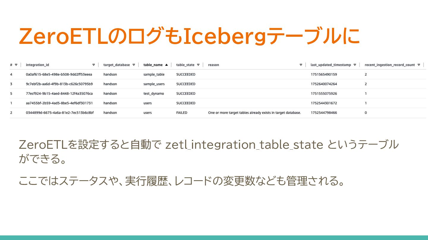 ZeroETLのログもIcebergテーブルに ZeroETLを設定すると自動で zetl_integration_table_state というテーブル ができる。 ここではステータスや、実行履歴、レコードの変更数なども管理される。