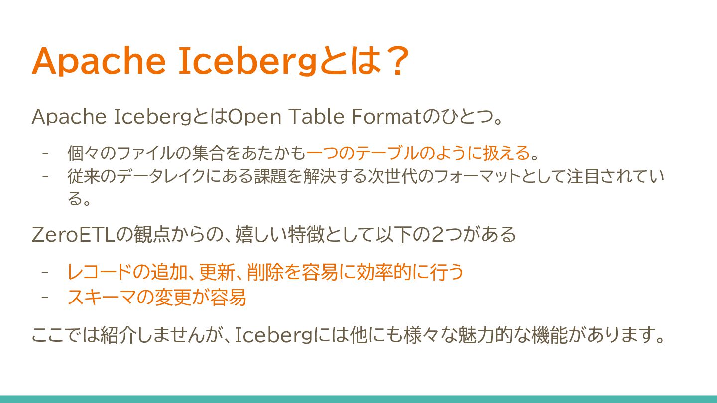 る。 ZeroETLの観点からの、嬉しい特徴として以下の2つがある - レコードの追加、更新、削除を容易に効率的に行う - スキーマの変更が容易 ここでは紹介しませんが、Icebergには他にも様々な魅力的な機能があります。
