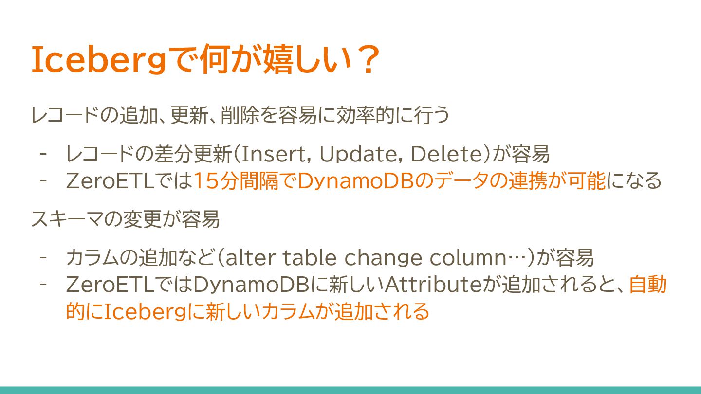 カラムの追加など(alter table change column…)が容易 - ZeroETLではDynamoDBに新しいAttributeが追加されると、自動 的にIcebergに新しいカラムが追加される