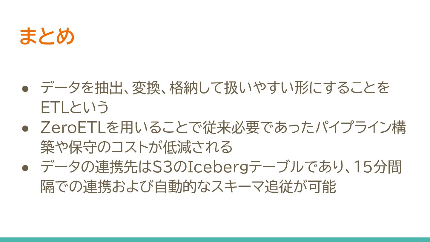 まとめ • データを抽出、変換、格納して扱いやすい形にすることを ETLという • ZeroETLを用いることで従来必要であったパイプライン構 築や保守のコストが低減される • データの連携先はS3のIcebergテーブルであり、15分間 隔での連携および自動的なスキーマ追従が可能