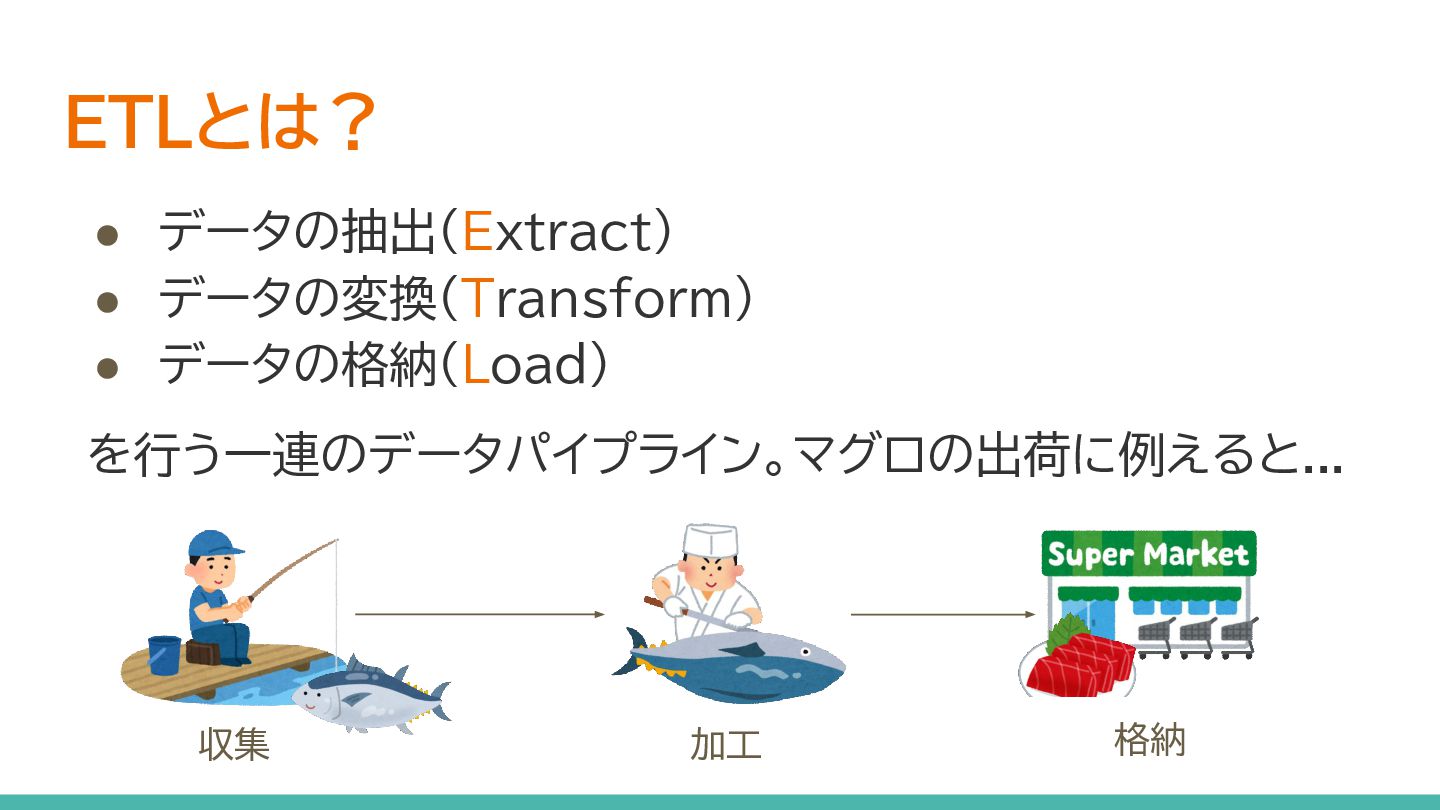 • データの抽出(Extract) • データの変換(Transform) • データの格納(Load) を行う一連のデータパイプライン。マグロの出荷に例えると... ETLとは? 収集 加工