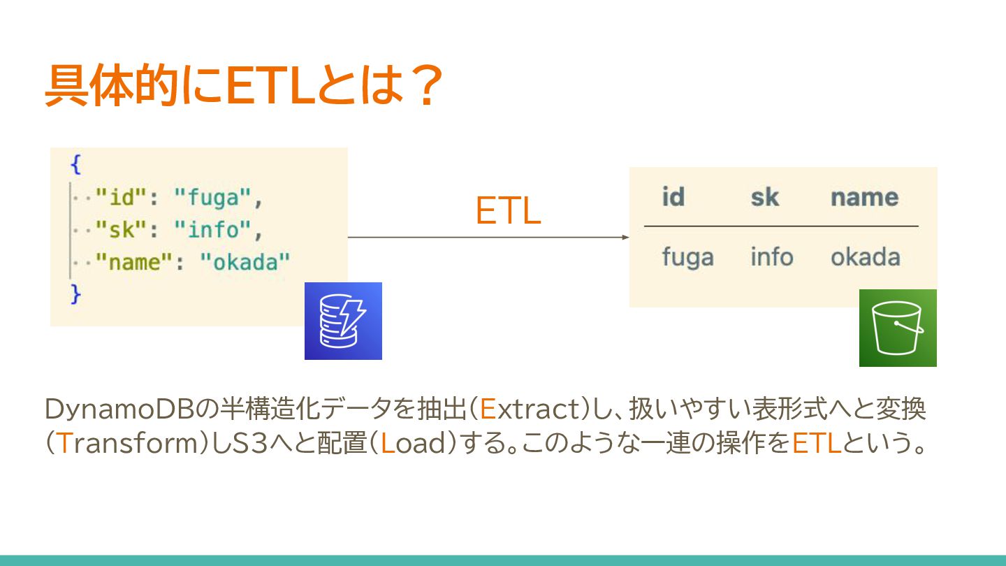 具体的にETLとは? DynamoDBの半構造化データを抽出(Extract)し、扱いやすい表形式へと変換 (Transform)しS3へと配置(Load)する。このような一連の操作をETLという。 ETL