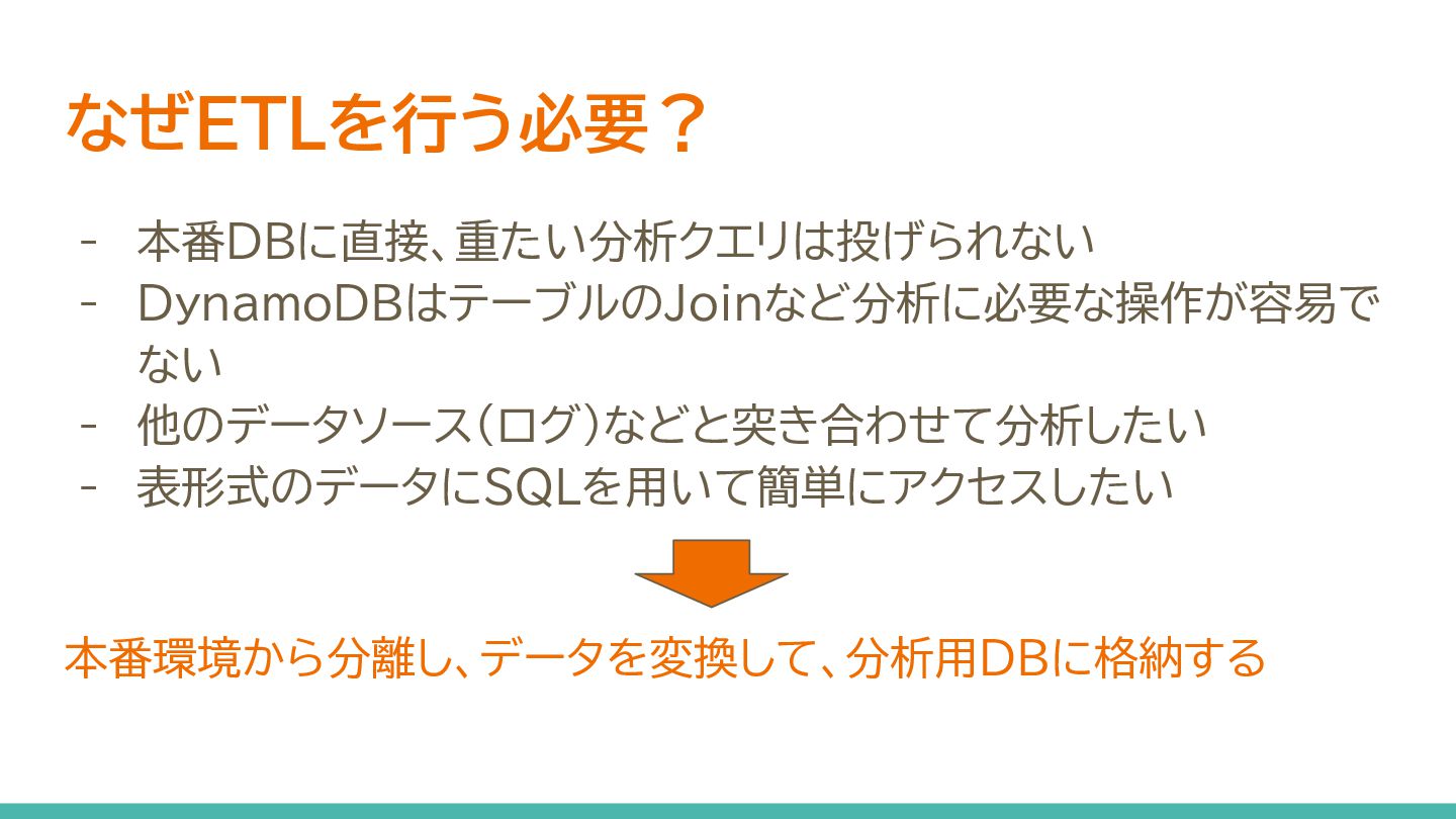 なぜETLを行う必要? - 本番DBに直接、重たい分析クエリは投げられない - DynamoDBはテーブルのJoinなど分析に必要な操作が容易で ない - 他のデータソース(ログ)などと突き合わせて分析したい - 表形式のデータにSQLを用いて簡単にアクセスしたい