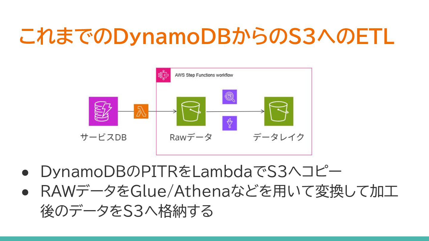 これまでのDynamoDBからのS3へのETL • DynamoDBのPITRをLambdaでS3へコピー • RAWデータをGlue/Athenaなどを用いて変換して加工 後のデータをS3へ格納する