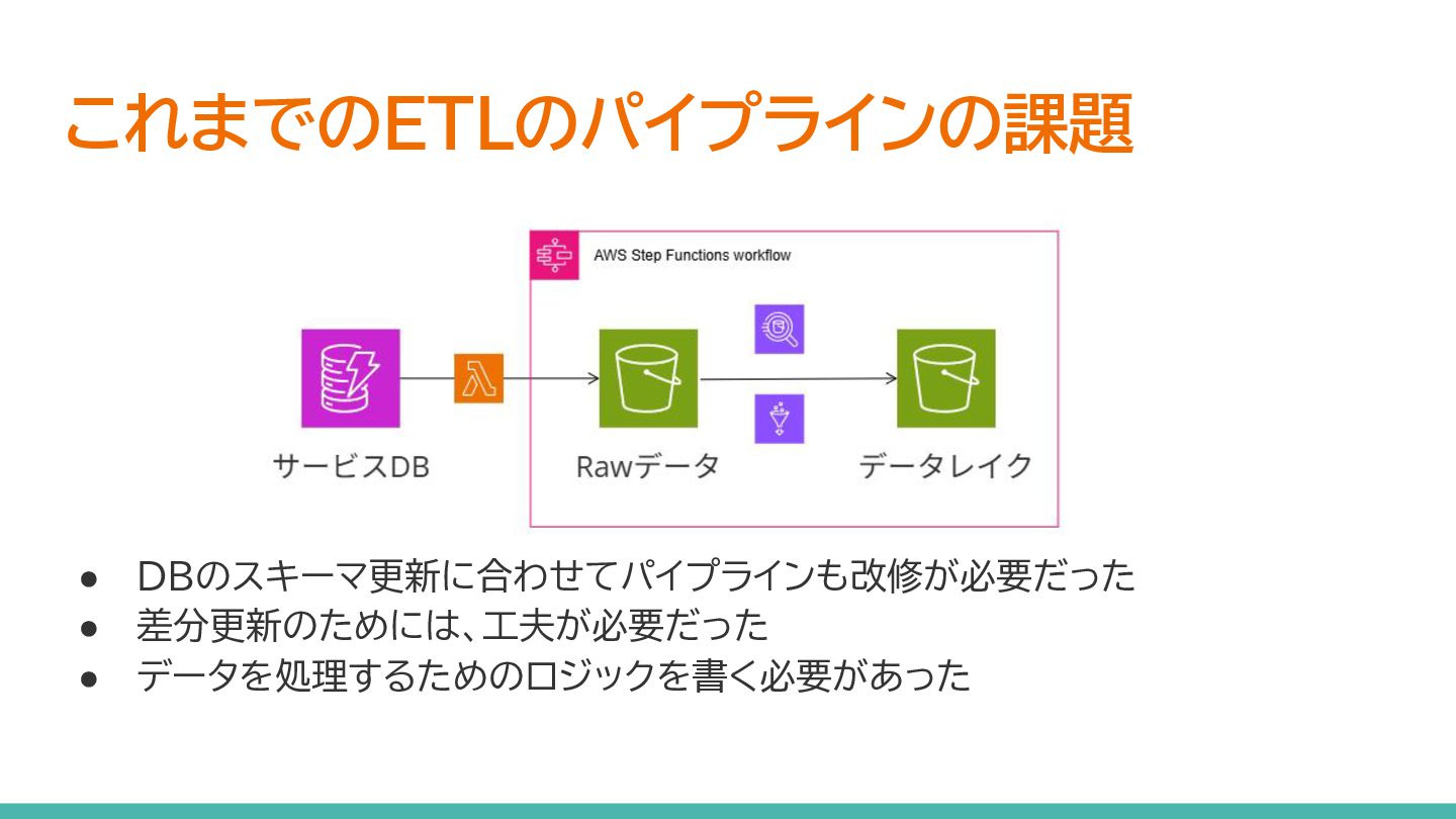 これまでのETLのパイプラインの課題 • DBのスキーマ更新に合わせてパイプラインも改修が必要だった • 差分更新のためには、工夫が必要だった • データを処理するためのロジックを書く必要があった