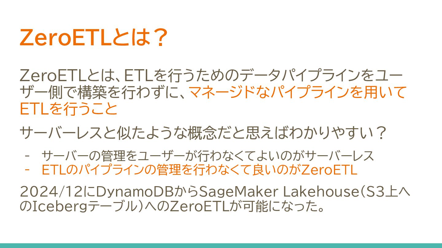 ZeroETLとは? ZeroETLとは、ETLを行うためのデータパイプラインをユー ザー側で構築を行わずに、マネージドなパイプラインを用いて ETLを行うこと サーバーレスと似たような概念だと思えばわかりやすい? - サーバーの管理をユーザーが行わなくてよいのがサーバーレス - ETLのパイプラインの管理を行わなくて良いのがZeroETL 2024/12にDynamoDBからSageMaker