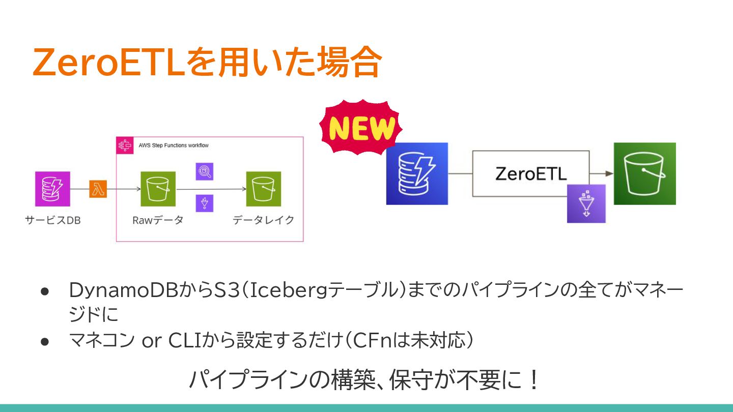 ZeroETLを用いた場合 • DynamoDBからS3(Icebergテーブル)までのパイプラインの全てがマネー ジドに • マネコン or CLIから設定するだけ(CFnは未対応) パイプラインの構築、保守が不要に!