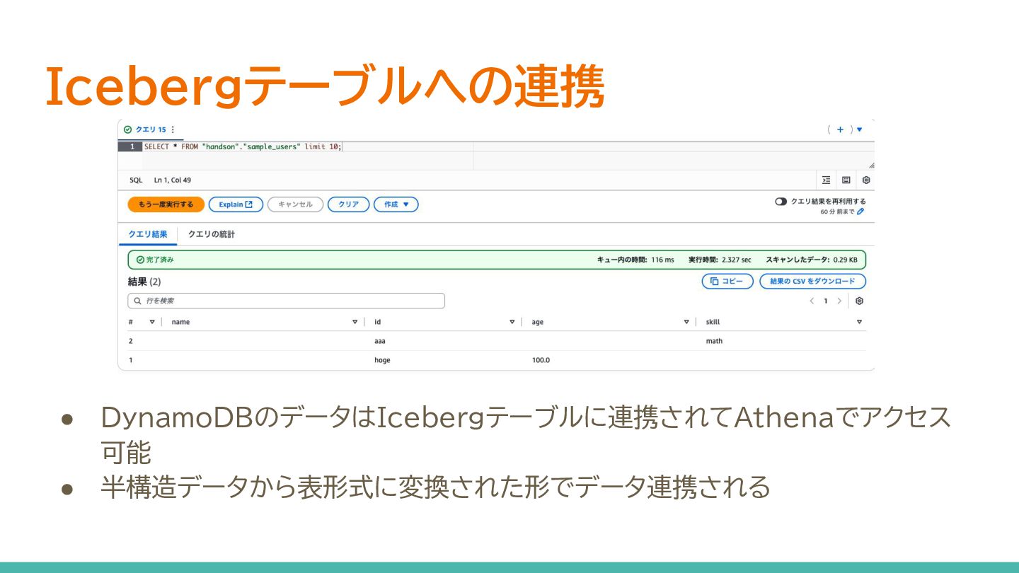 Icebergテーブルへの連携 • DynamoDBのデータはIcebergテーブルに連携されてAthenaでアクセス 可能 • 半構造データから表形式に変換された形でデータ連携される