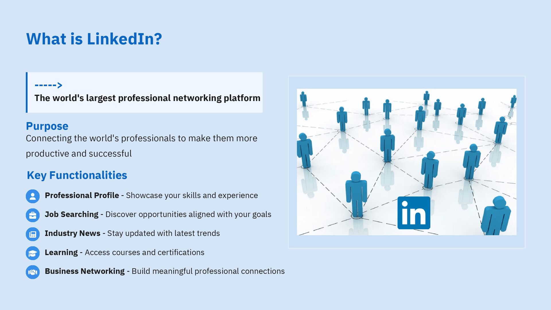 Purpose Connecting the world's professionals to make them more productive and successful Key Functionalities Professional Profile - Showcase your skills and experience Job Searching - Discover opportunities aligned with your goals Industry News - Stay updated with latest trends Learning - Access courses and certifications Business Networking - Build meaningful professional connections