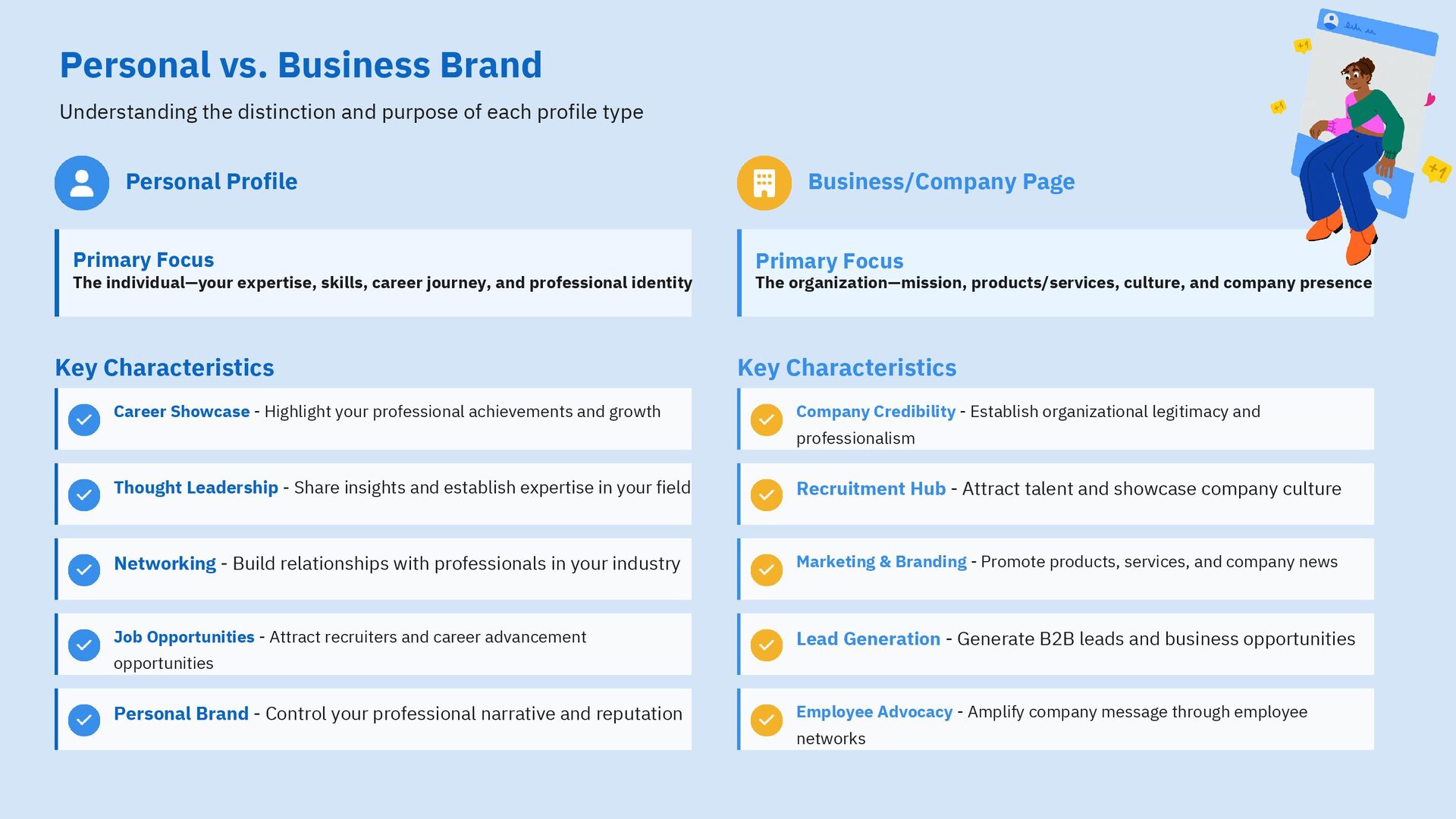 each profile type Personal Profile Primary Focus The individualโyour expertise, skills, career journey, and professional identity Key Characteristics Career Showcase - Highlight your professional achievements and growth Thought Leadership - Share insights and establish expertise in your field Networking - Build relationships with professionals in your industry Job Opportunities - Attract recruiters and career advancement opportunities Personal Brand - Control your professional narrative and reputation Business/Company Page Primary Focus The organizationโmission, products/services, culture, and company presence Key Characteristics Company Credibility - Establish organizational legitimacy and professionalism Recruitment Hub - Attract talent and showcase company culture Marketing & Branding - Promote products, services, and company news Lead Generation - Generate B2B leads and business opportunities Employee Advocacy - Amplify company message through employee networks