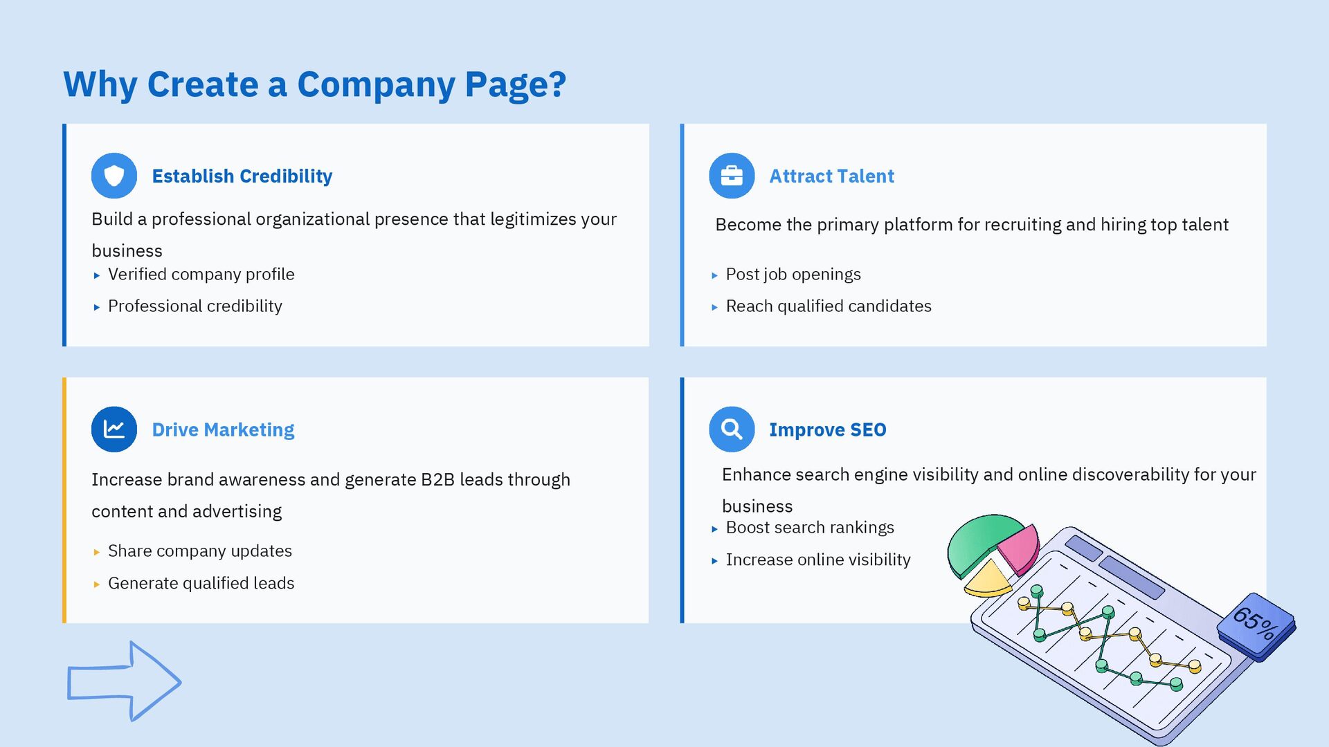 organizational presence that legitimizes your business โธ Verified company profile โธ Professional credibility Attract Talent Become the primary platform for recruiting and hiring top talent โธ Post job openings โธ Reach qualified candidates Drive Marketing Increase brand awareness and generate B2B leads through content and advertising โธ Share company updates โธ Generate qualified leads Improve SEO Enhance search engine visibility and online discoverability for your business โธ Boost search rankings โธ Increase online visibility