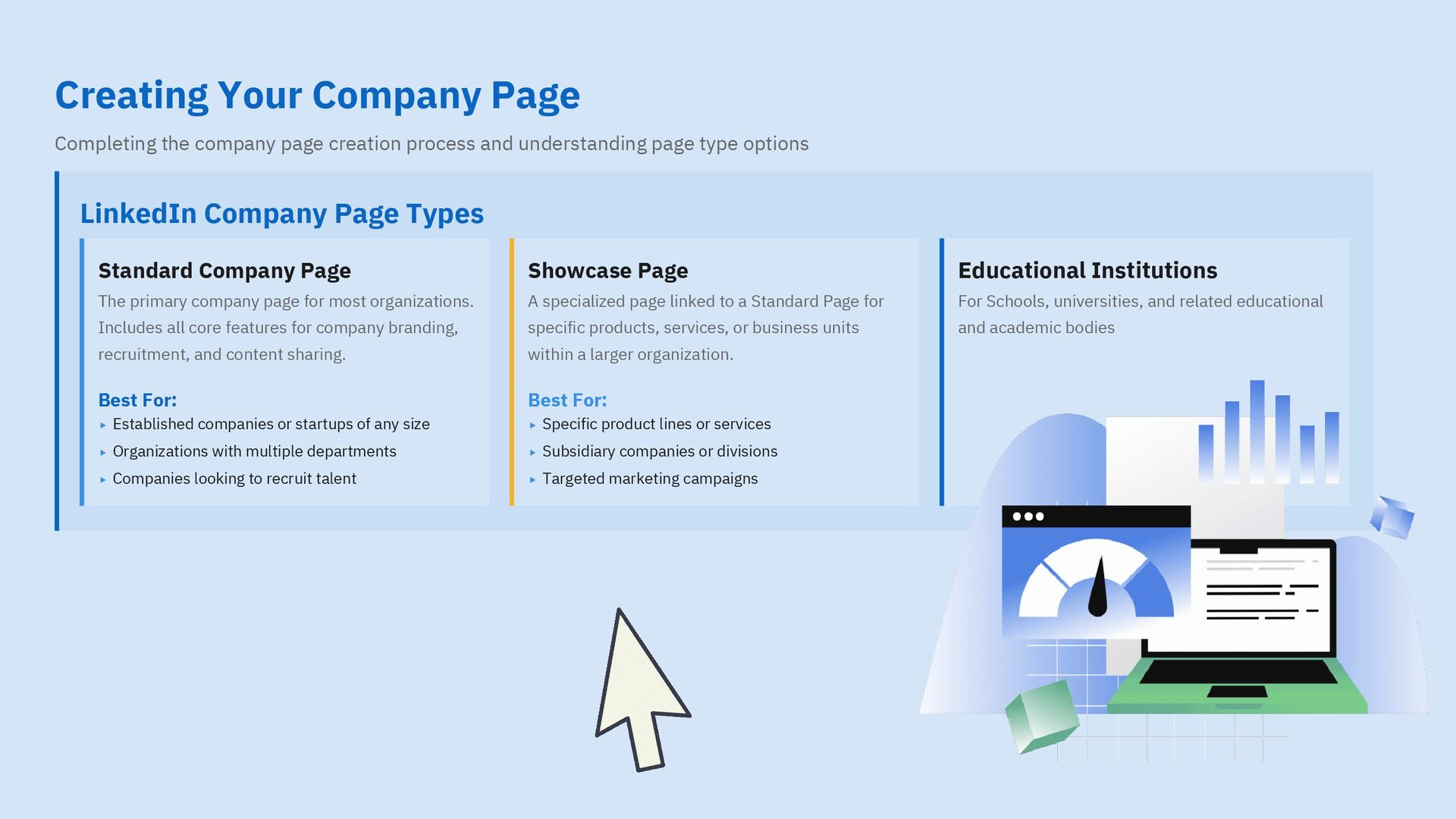 departments Specific product lines or services Creating Your Company Page Completing the company page creation process and understanding page type options LinkedIn Company Page Types Standard Company Page The primary company page for most organizations. Includes all core features for company branding, recruitment, and content sharing. Best For: โธ โธ โธ Companies looking to recruit talent Showcase Page A specialized page linked to a Standard Page for specific products, services, or business units within a larger organization. Best For: โธ โธ Subsidiary companies or divisions โธ Targeted marketing campaigns Educational Institutions For Schools, universities, and related educational and academic bodies
