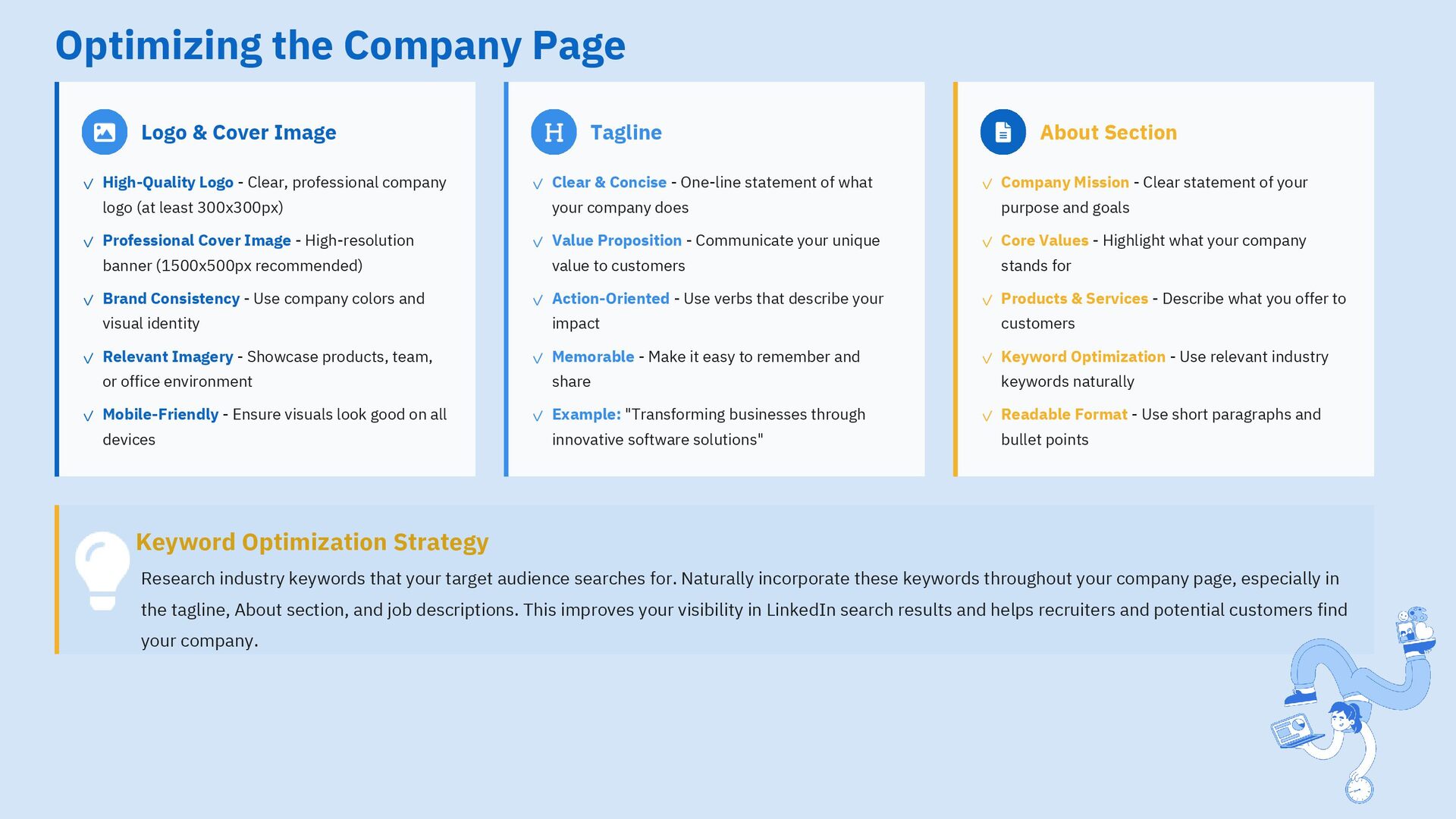 Logo - Clear, professional company logo (at least 300x300px) โ Professional Cover Image - High-resolution banner (1500x500px recommended) โ Brand Consistency - Use company colors and visual identity โ Relevant Imagery - Showcase products, team, or office environment โ Mobile-Friendly - Ensure visuals look good on all devices Tagline โ Clear & Concise - One-line statement of what your company does โ Value Proposition - Communicate your unique value to customers โ Action-Oriented - Use verbs that describe your impact โ Memorable - Make it easy to remember and share โ Example: "Transforming businesses through innovative software solutions" About Section โ Company Mission - Clear statement of your purpose and goals โ Core Values - Highlight what your company stands for โ Products & Services - Describe what you offer to customers โ Keyword Optimization - Use relevant industry keywords naturally โ Readable Format - Use short paragraphs and bullet points Keyword Optimization Strategy Research industry keywords that your target audience searches for. Naturally incorporate these keywords throughout your company page, especially in the tagline, About section, and job descriptions. This improves your visibility in LinkedIn search results and helps recruiters and potential customers find your company.