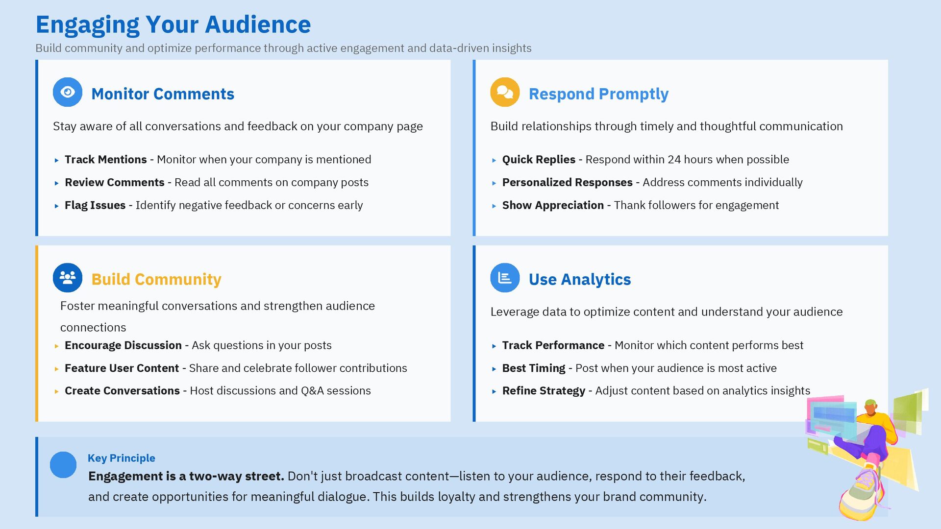 Audience Build community and optimize performance through active engagement and data-driven insights Monitor Comments Stay aware of all conversations and feedback on your company page โธ Track Mentions - Monitor when your company is mentioned โธ Review Comments - Read all comments on company posts โธ Flag Issues - Identify negative feedback or concerns early Respond Promptly Build relationships through timely and thoughtful communication โธ Quick Replies - Respond within 24 hours when possible โธ Personalized Responses - Address comments individually โธ Show Appreciation - Thank followers for engagement Build Community Foster meaningful conversations and strengthen audience connections โธ Encourage Discussion - Ask questions in your posts โธ Feature User Content - Share and celebrate follower contributions โธ Use Analytics Leverage data to optimize content and understand your audience โธ Track Performance - Monitor which content performs best โธ Best Timing - Post when your audience is most active โธ Refine Strategy - Adjust content based on analytics insights Key Principle Engagement is a two-way street. Don't just broadcast contentโlisten to your audience, respond to their feedback, and create opportunities for meaningful dialogue. This builds loyalty and strengthens your brand community.