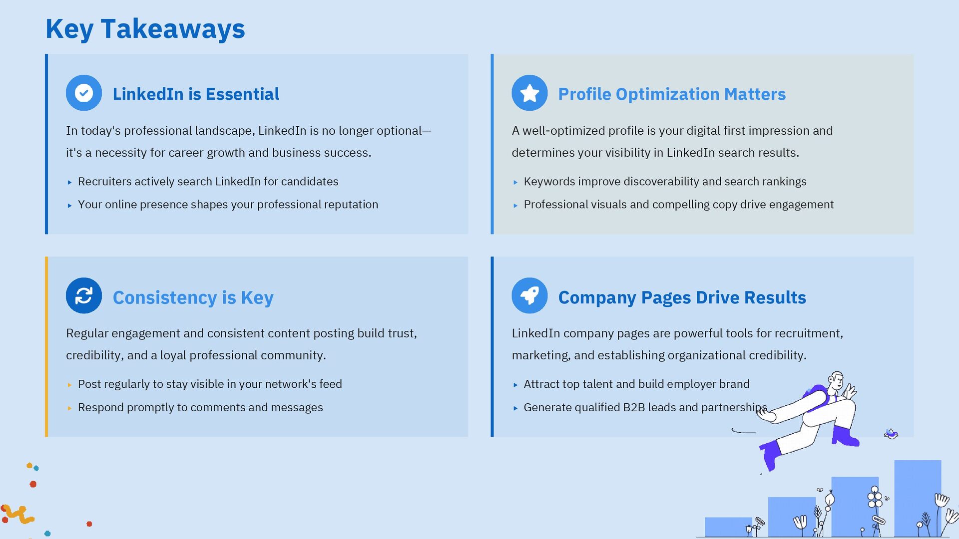 is no longer optionalโ it's a necessity for career growth and business success. โธ Recruiters actively search LinkedIn for candidates โธ Your online presence shapes your professional reputation Profile Optimization Matters A well-optimized profile is your digital first impression and determines your visibility in LinkedIn search results. โธ Keywords improve discoverability and search rankings โธ Professional visuals and compelling copy drive engagement Consistency is Key Regular engagement and consistent content posting build trust, credibility, and a loyal professional community. โธ Post regularly to stay visible in your network's feed โธ Respond promptly to comments and messages Company Pages Drive Results LinkedIn company pages are powerful tools for recruitment, marketing, and establishing organizational credibility. โธ Attract top talent and build employer brand โธ Generate qualified B2B leads and partnerships