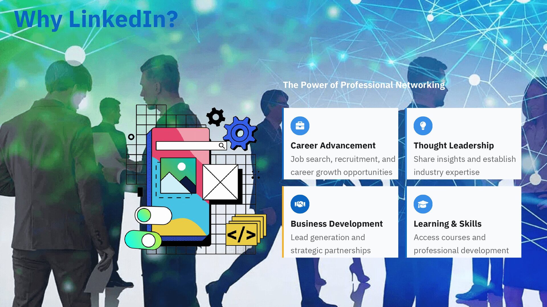 Power of Professional Networking Career Advancement Thought Leadership Share insights and establish industry expertise Business Development Lead generation and strategic partnerships Learning & Skills Access courses and professional development