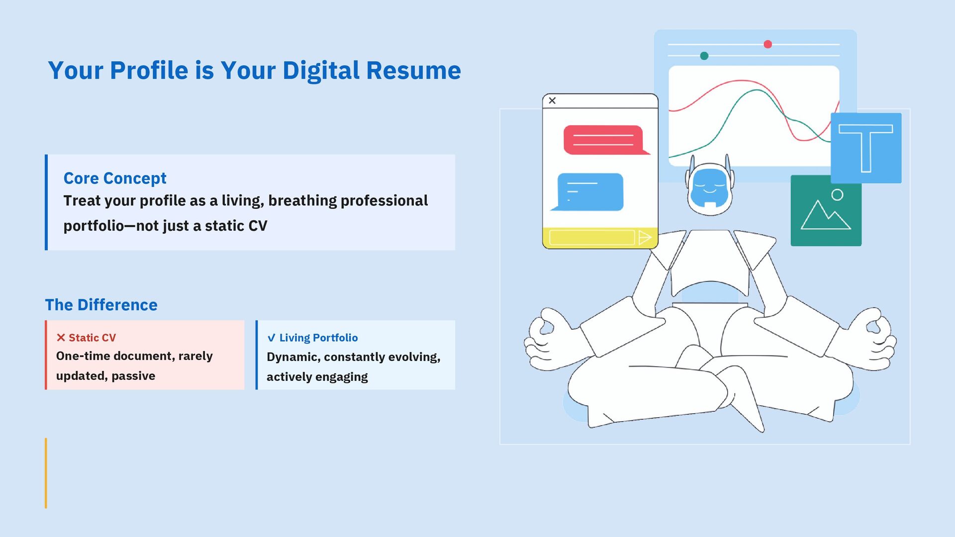 profile as a living, breathing professional portfolioโnot just a static CV The Difference โ Static CV One-time document, rarely updated, passive โ Living Portfolio Dynamic, constantly evolving, actively engaging