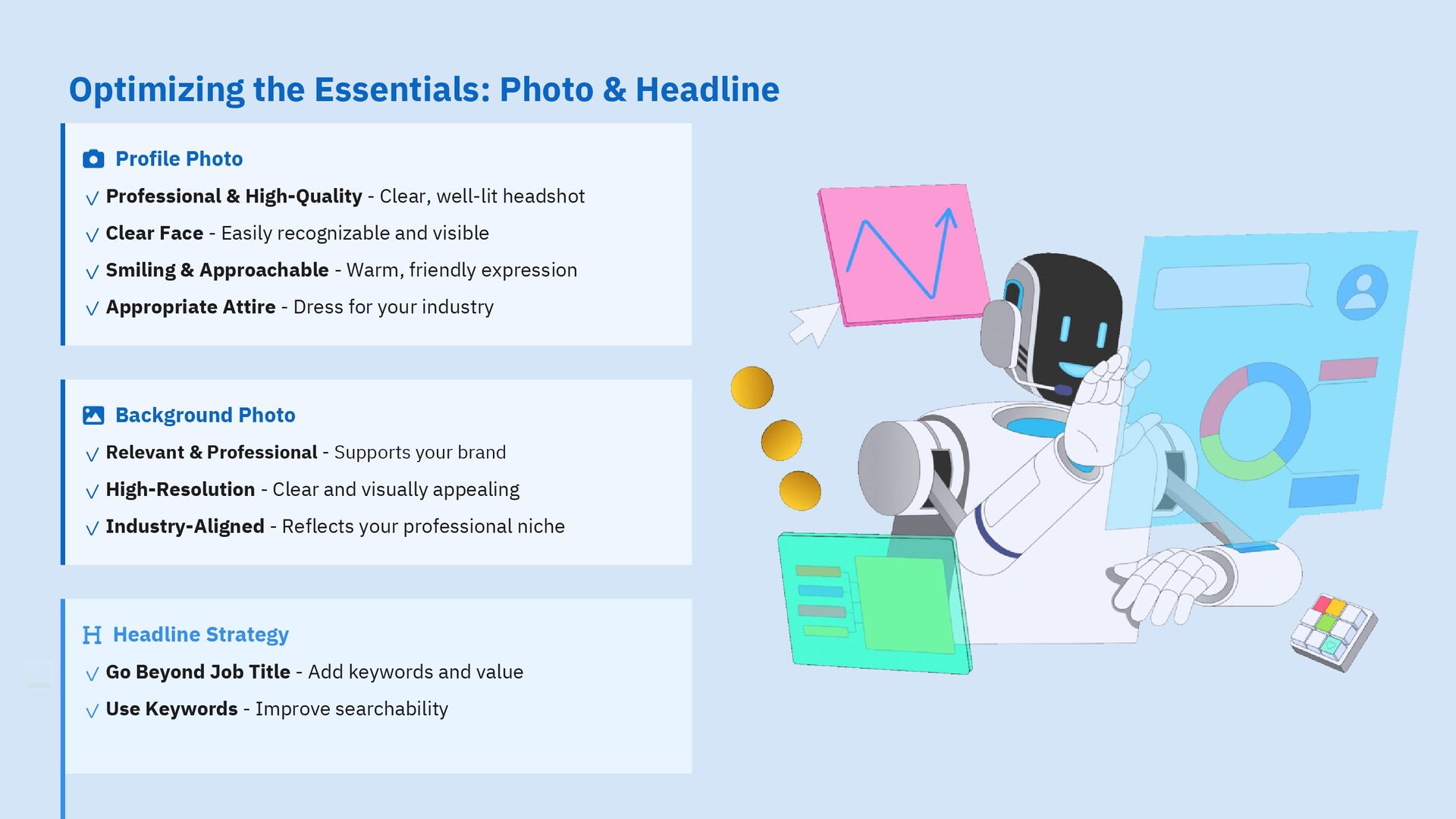 & High-Quality - Clear, well-lit headshot โ Clear Face - Easily recognizable and visible โ Smiling & Approachable - Warm, friendly expression โ Appropriate Attire - Dress for your industry Background Photo โ Relevant & Professional - Supports your brand โ High-Resolution - Clear and visually appealing โ Industry-Aligned - Reflects your professional niche Headline Strategy โ Go Beyond Job Title - Add keywords and value โ Use Keywords - Improve searchability