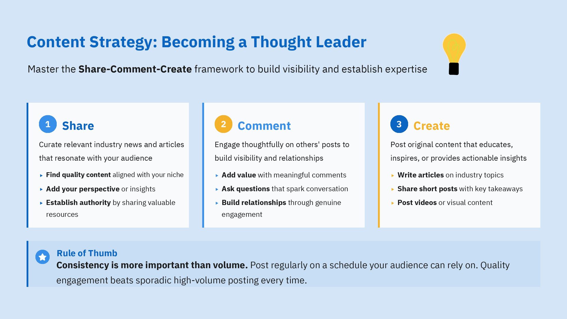 value with meaningful comments Ask questions that spark conversation 3 Content Strategy: Becoming a Thought Leader Master the Share-Comment-Create framework to build visibility and establish expertise Share Curate relevant industry news and articles that resonate with your audience โธ โธ Add your perspective or insights โธ Establish authority by sharing valuable resources Comment Engage thoughtfully on others' posts to build visibility and relationships โธ โธ โธ Build relationships through genuine engagement Create Post original content that educates, inspires, or provides actionable insights โธ Write articles on industry topics โธ Share short posts with key takeaways โธ Post videos or visual content Rule of Thumb Consistency is more important than volume. Post regularly on a schedule your audience can rely on. Quality engagement beats sporadic high-volume posting every time.