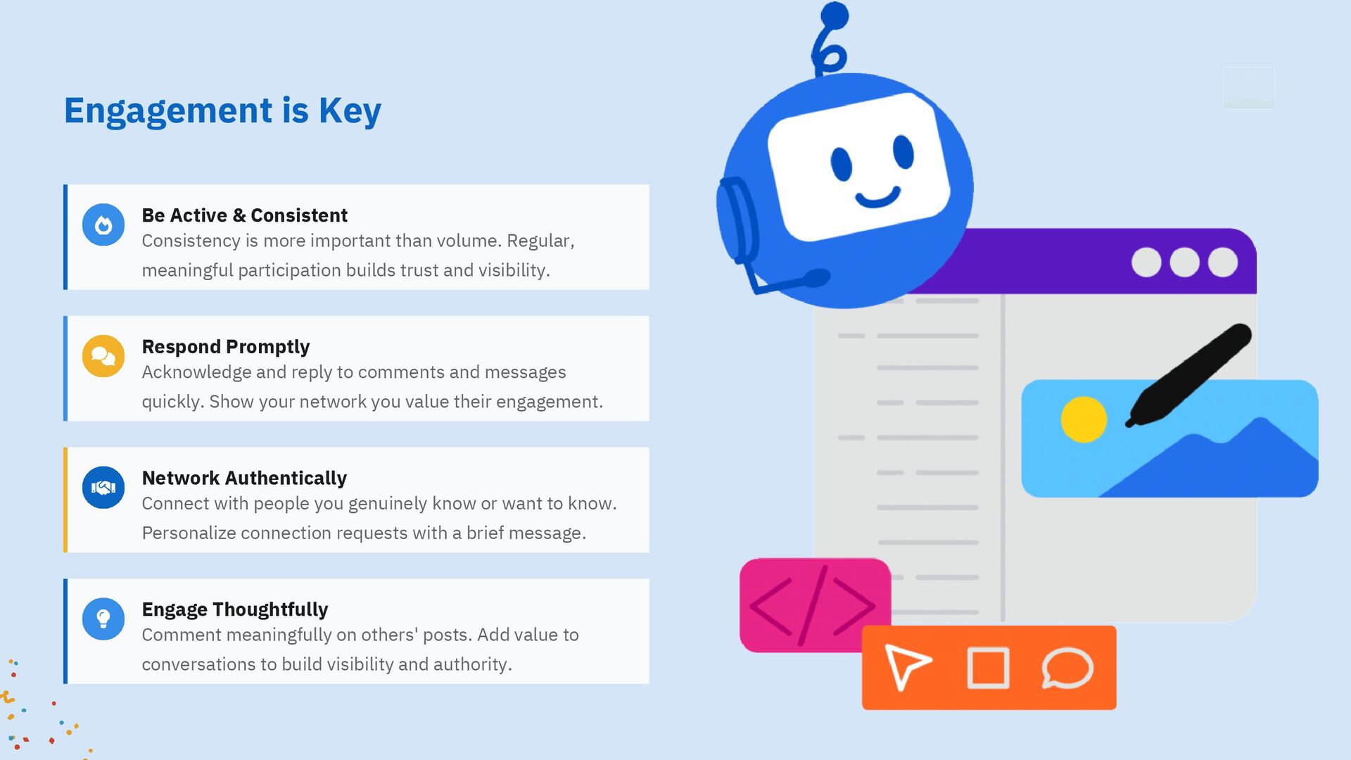 important than volume. Regular, meaningful participation builds trust and visibility. Respond Promptly Acknowledge and reply to comments and messages quickly. Show your network you value their engagement. Network Authentically Connect with people you genuinely know or want to know. Personalize connection requests with a brief message. Engage Thoughtfully Comment meaningfully on others' posts. Add value to conversations to build visibility and authority.