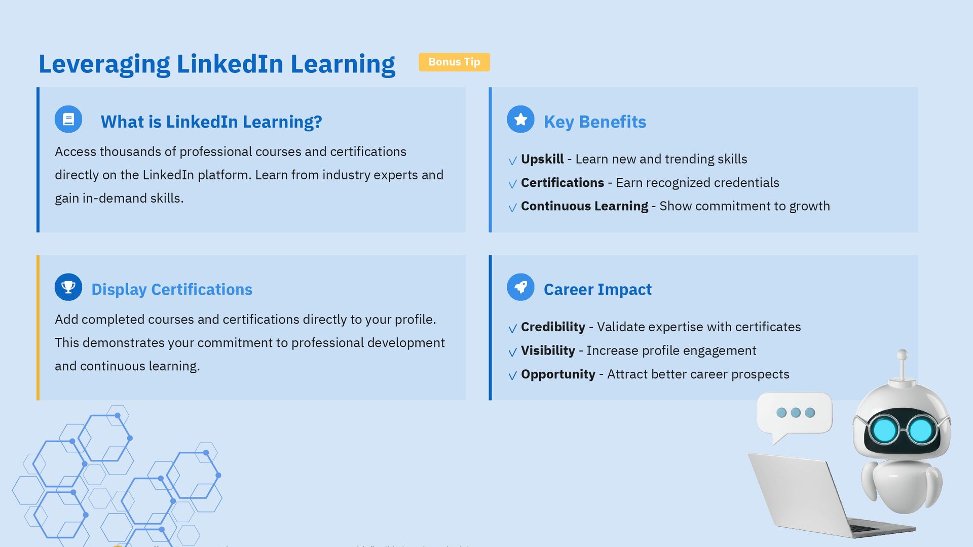 thousands of professional courses and certifications directly on the LinkedIn platform. Learn from industry experts and gain in-demand skills. Key Benefits โ Upskill - Learn new and trending skills โ Certifications - Earn recognized credentials โ Continuous Learning - Show commitment to growth Display Certifications Add completed courses and certifications directly to your profile. This demonstrates your commitment to professional development and continuous learning. Career Impact โ Credibility - Validate expertise with certificates โ Visibility - Increase profile engagement โ Opportunity - Attract better career prospects