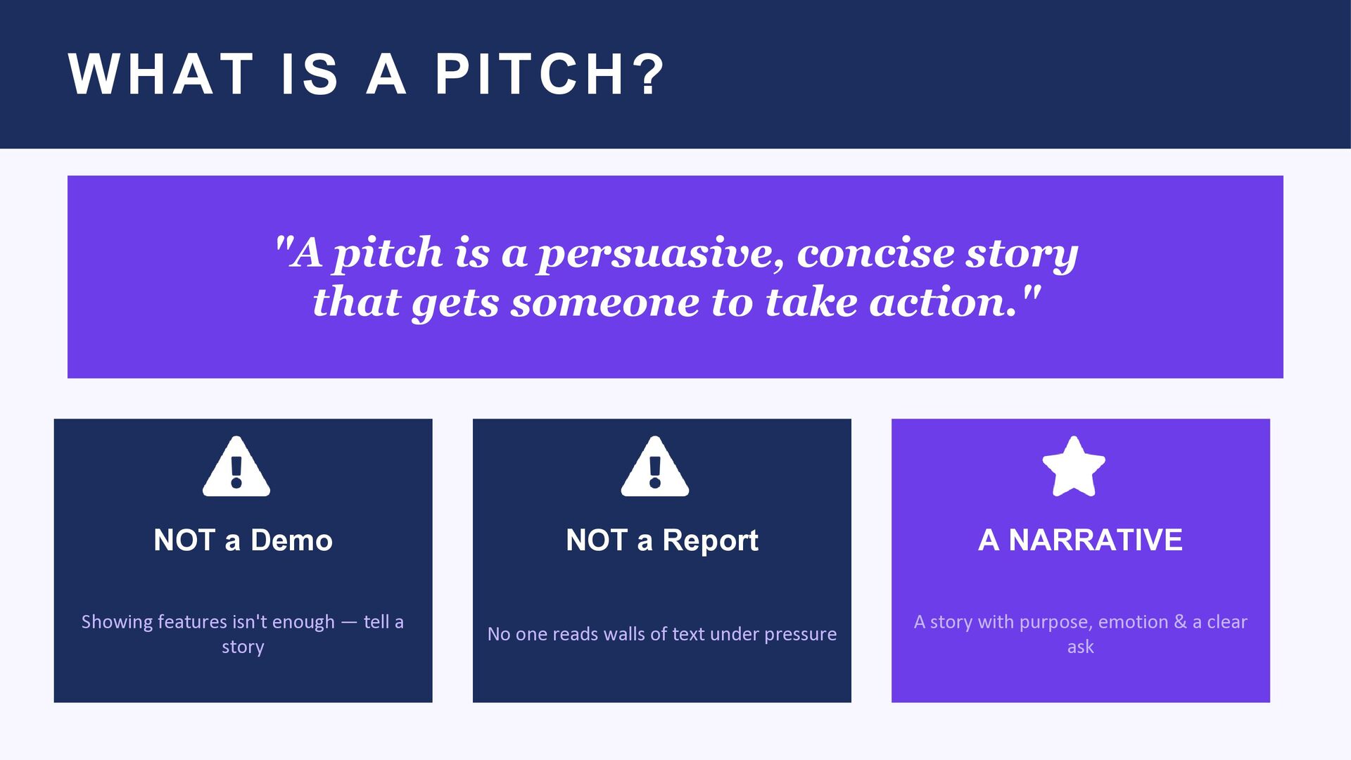story that gets someone to take action." NOT a Demo Showing features isn't enough — tell a story NOT a Report No one reads walls of text under pressure A NARRATIVE A story with purpose, emotion & a clear ask