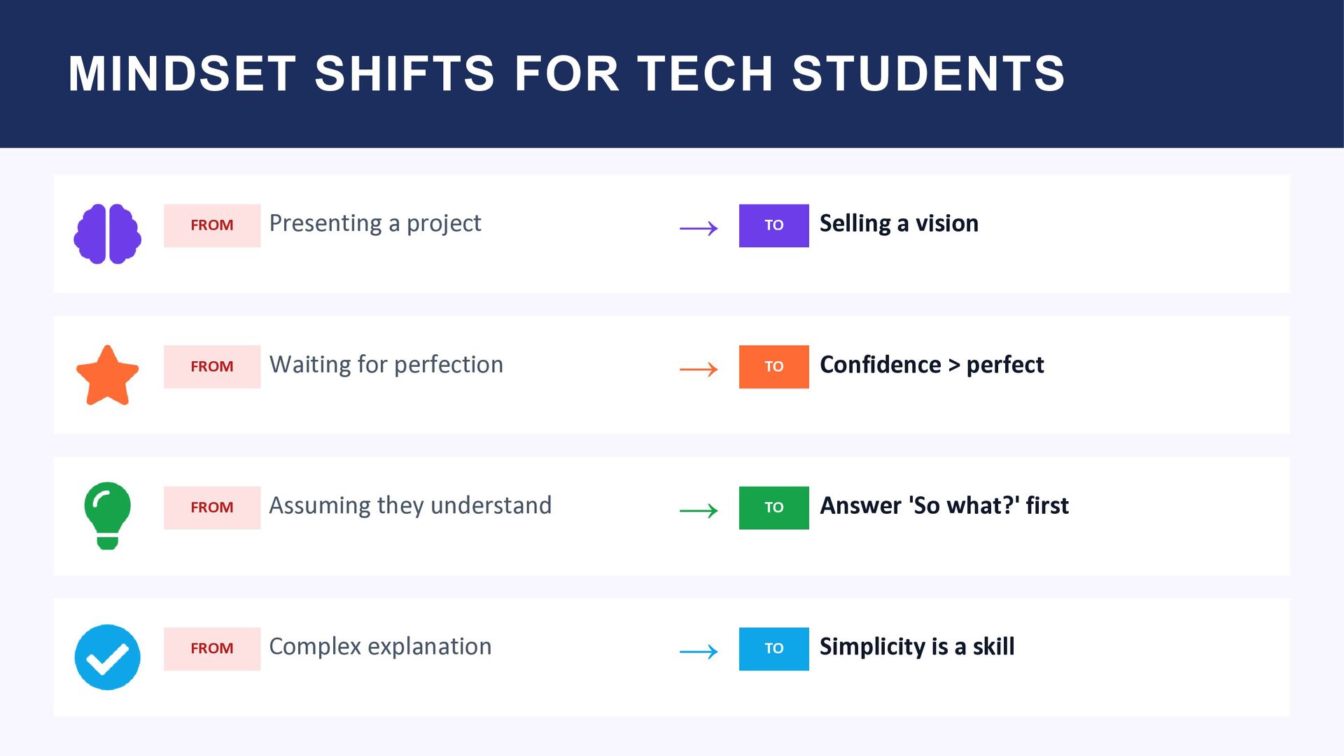 TO Selling a vision FROM Waiting for perfection → TO Confidence > perfect FROM Assuming they understand → TO Answer 'So what?' first FROM Complex explanation → TO Simplicity is a skill