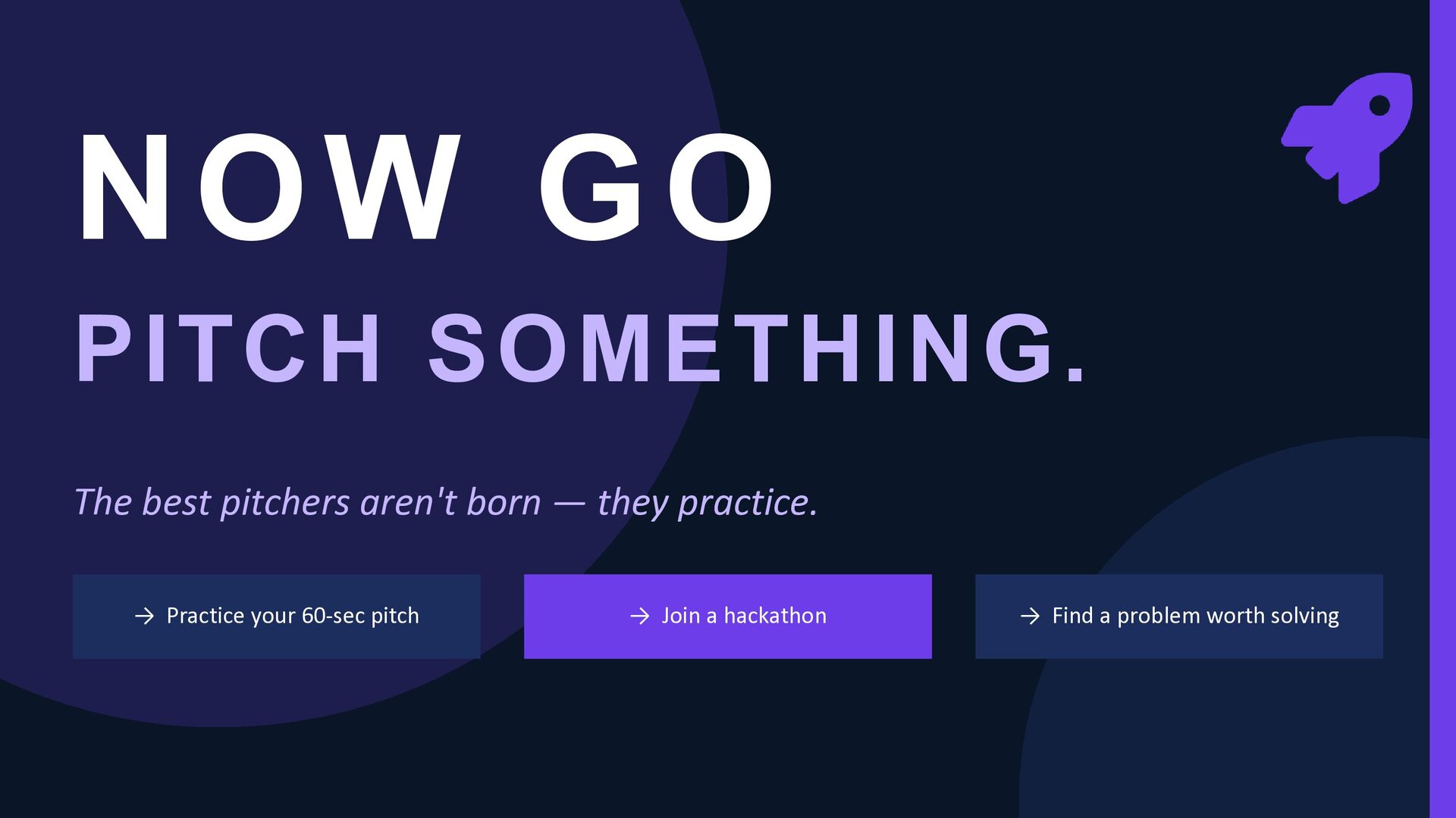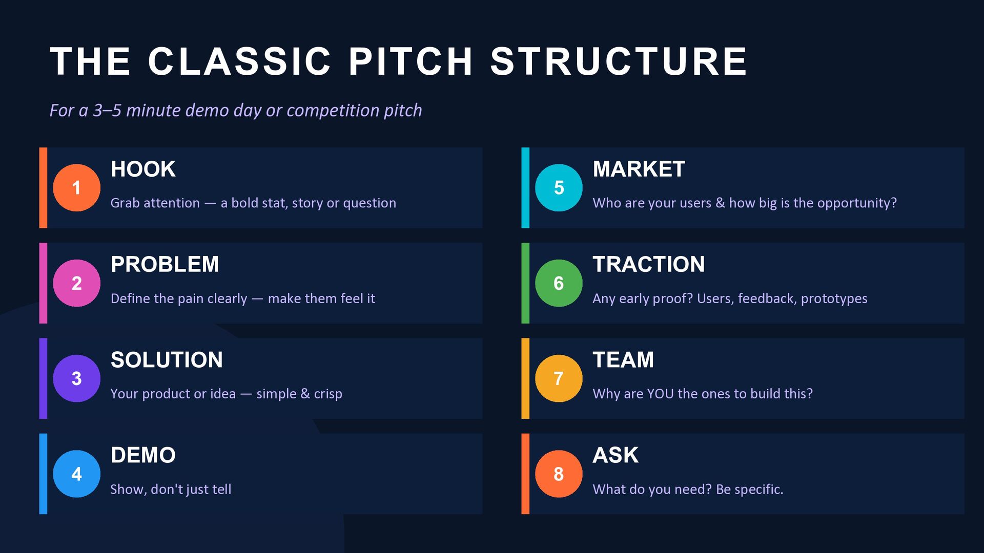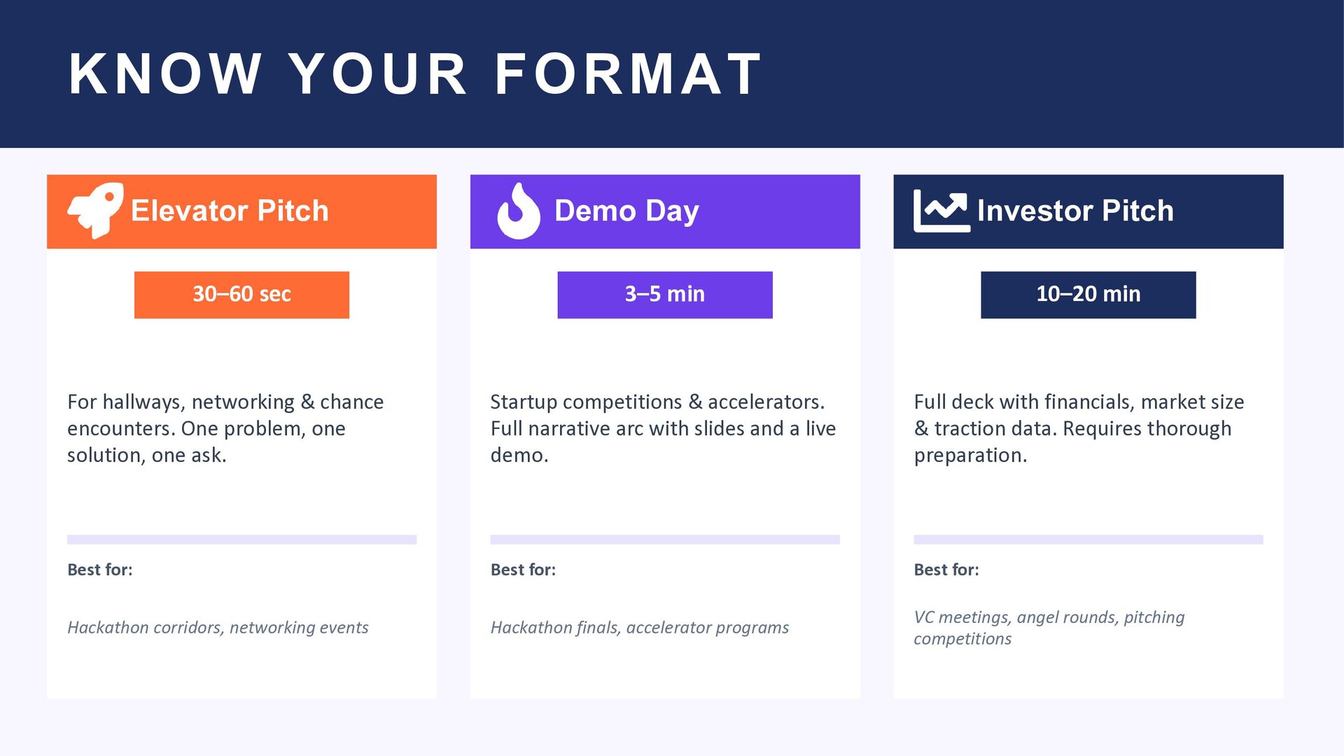& chance encounters. One problem, one solution, one ask. Best for: Hackathon corridors, networking events Demo Day 3–5 min Startup competitions & accelerators. Full narrative arc with slides and a live demo. Best for: Hackathon finals, accelerator programs Investor Pitch 10–20 min Full deck with financials, market size & traction data. Requires thorough preparation. Best for: VC meetings, angel rounds, pitching competitions