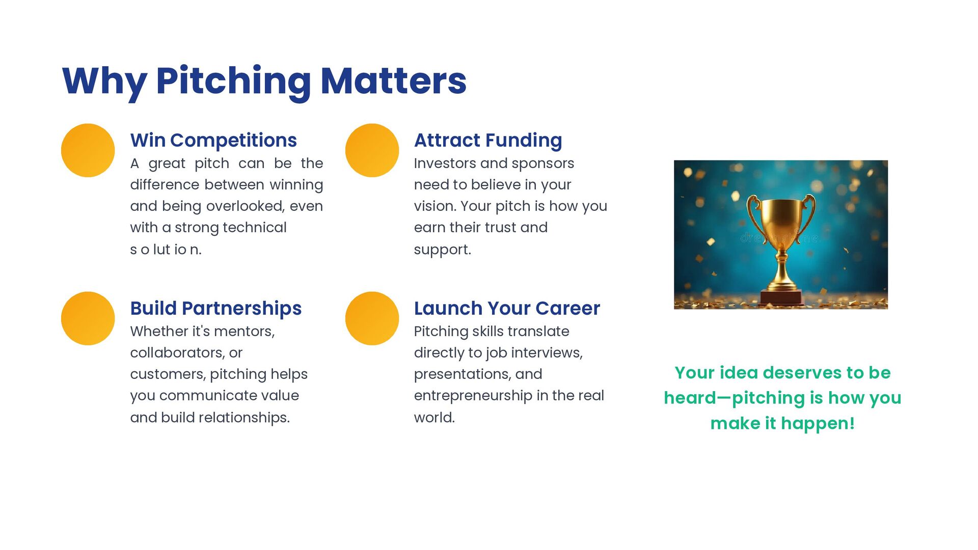 the difference between winning and being overlooked, even with a strong technical s o lut io n. Build Partnerships Whether it's mentors, collaborators, or customers, pitching helps you communicate value and build relationships. Attract Funding Investors and sponsors need to believe in your vision. Your pitch is how you earn their trust and support. Launch Your Career Pitching skills translate directly to job interviews, presentations, and entrepreneurship in the real world. Your idea deserves to be heard—pitching is how you make it happen!