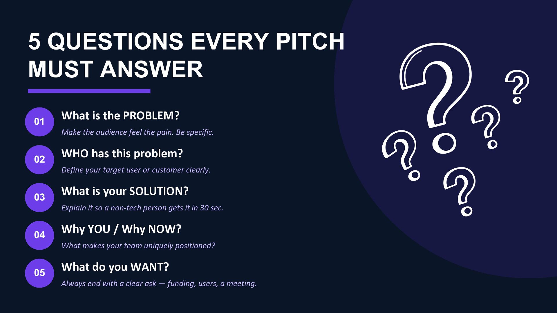 PROBLEM? Make the audience feel the pain. Be specific. 02 WHO has this problem? Define your target user or customer clearly. 03 What is your SOLUTION? Explain it so a non-tech person gets it in 30 sec. 04 Why YOU / Why NOW? What makes your team uniquely positioned? 05 What do you WANT? Always end with a clear ask — funding, users, a meeting.
