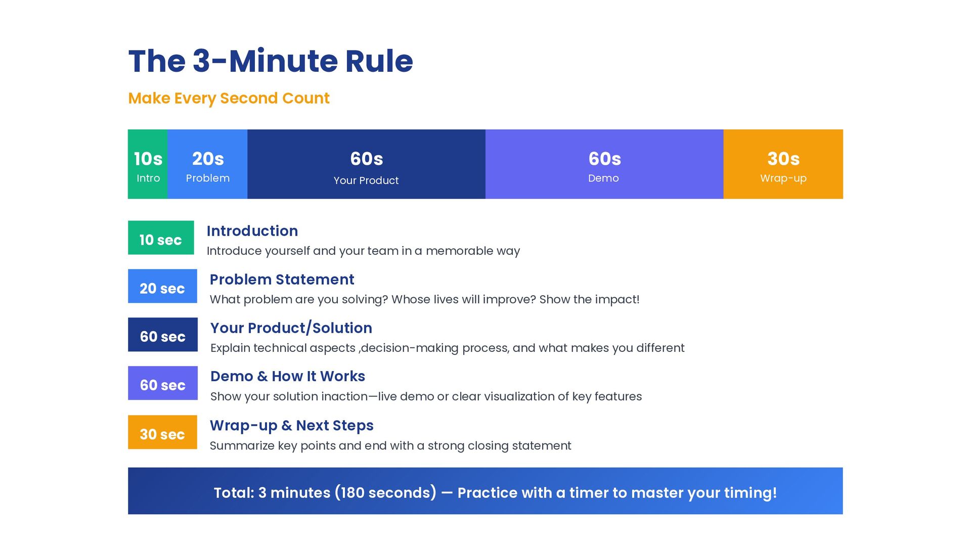sec 30 sec 60 sec 60 sec Introduction Problem Statement Demo & How It Works Your Product/Solution Wrap-up & Next Steps Total: 3 minutes (180 seconds) — Practice with a timer to master your timing! Introduce yourself and your team in a memorable way Summarize key points and end with a strong closing statement What problem are you solving? Whose lives will improve? Show the impact! Show your solution inaction—live demo or clear visualization of key features Explain technical aspects ,decision-making process, and what makes you different 10s Intro 20s Problem 60s 60s Demo 30s Wrap-up Your Product