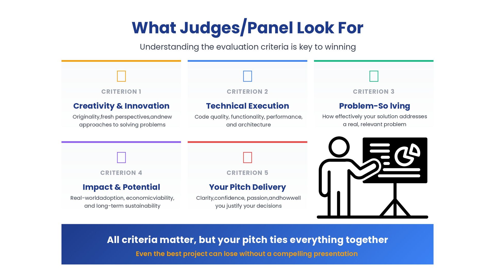 Your Pitch Delivery Technical Execution Understanding the evaluation criteria is key to winning Problem-So lving How effectively your solution addresses a real, relevant problem CRITERION 4 CRITERION 1 CRITERION 2 CRITERION 5 CRITERION 3 Originality,fresh perspectives,andnew approaches to solving problems Real-worldadoption, economicviability, and long-term sustainability Code quality, functionality, performance, and architecture Clarity,confidence, passion,andhowwell you justify your decisions All criteria matter, but your pitch ties everything together Even the best project can lose without a compelling presentation