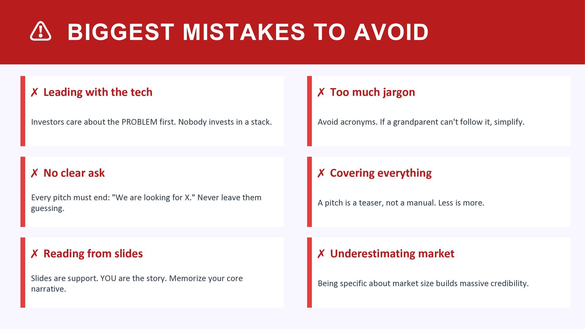 Investors care about the PROBLEM first. Nobody invests in a stack. ✗ Too much jargon Avoid acronyms. If a grandparent can't follow it, simplify. ✗ No clear ask Every pitch must end: "We are looking for X." Never leave them guessing. ✗ Covering everything A pitch is a teaser, not a manual. Less is more. ✗ Reading from slides Slides are support. YOU are the story. Memorize your core narrative. ✗ Underestimating market Being specific about market size builds massive credibility.