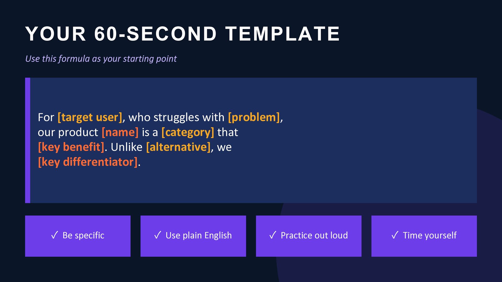 For [target user], who struggles with [problem], our product [name] is a [category] that [key benefit]. Unlike [alternative], we [key differentiator]. ✓ Be specific ✓ Use plain English ✓ Practice out loud ✓ Time yourself