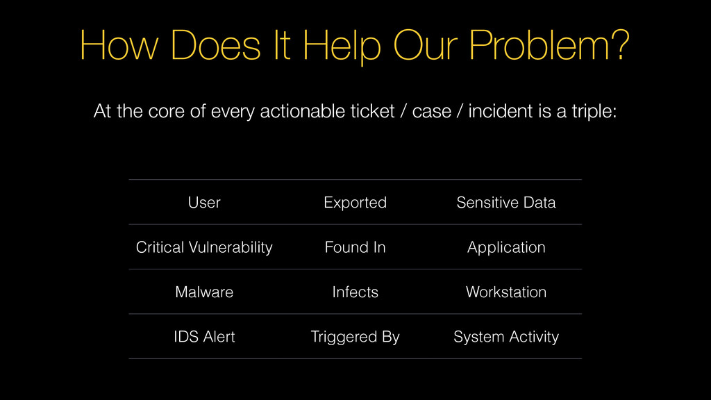 Critical Vulnerability Found In Application Malware Infects Workstation IDS Alert Triggered By System Activity At the core of every actionable ticket / case / incident is a triple:
