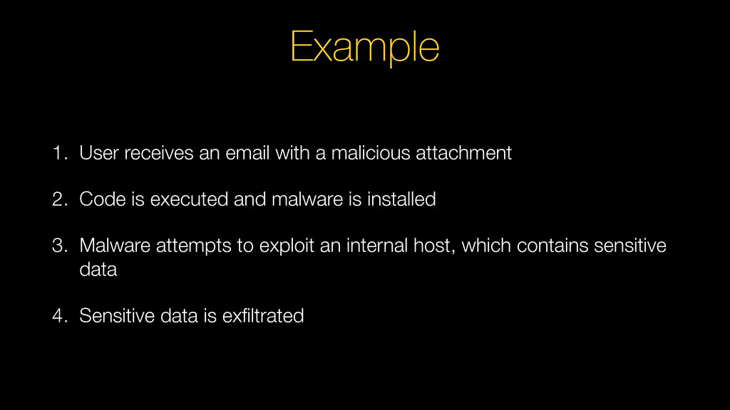 2. Code is executed and malware is installed 3. Malware attempts to exploit an internal host, which contains sensitive data 4. Sensitive data is exfiltrated