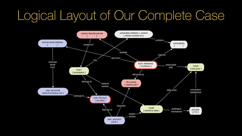 [ sensitive data ] vulnerable software + version [ Adobe Acrobat 8.0 ] system files/directories [ ] User (Person) [ Joe Bob ] source email address [ ] file (name) [ readme.pdf ] Actor (Malware) [ Conflicker ] vulnerability [ ] host1 [ workstation ] exfiltration mechanism received email from network access belongs to sent from updates exploits delivered by contains has user_account1 [ jbob ] belongs to system access executes user_account2 [ [email protected] ] belongs to data losss connection established located on associated with Logical Layout of Our Complete Case