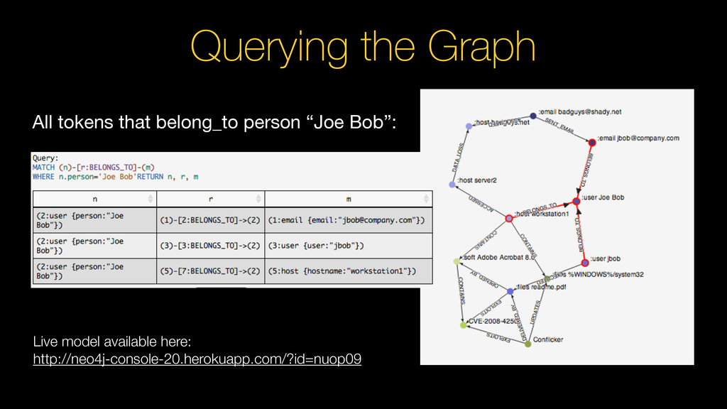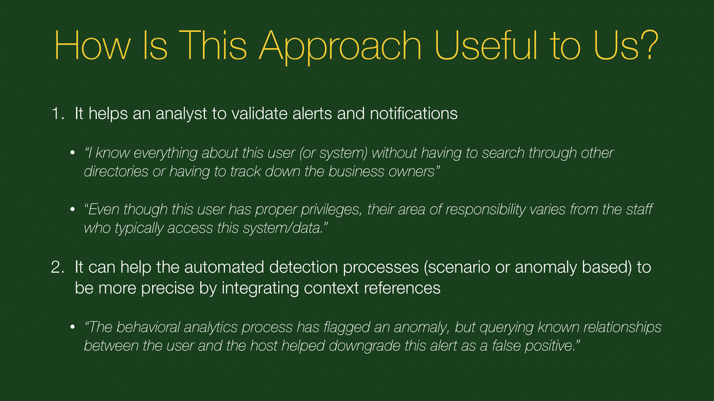 an analyst to validate alerts and notifications • “I know everything about this user (or system) without having to search through other directories or having to track down the business owners” • “Even though this user has proper privileges, their area of responsibility varies from the staff who typically access this system/data.” 2. It can help the automated detection processes (scenario or anomaly based) to be more precise by integrating context references • “The behavioral analytics process has flagged an anomaly, but querying known relationships between the user and the host helped downgrade this alert as a false positive.”